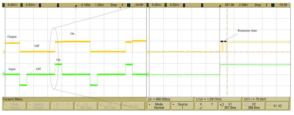 The bistable mechanism testing system is shown in Figure 14, the 3–5 voltage generated by B and K 2706 power amplifier incorporated with a GW waveform generator (GFG-8016G, GW, Inc., Taiwan, China) was input into the microcoil, and the outoput connected with DC power supply (Agilent E3646A Dual output NI, Inc., Santa Clara, CA, USA) and a resistor. Both the input and output were monitored by the oscilloscope (Agilent MSO6034, NI, Inc., Santa Clara, CA, USA) to observe the respsonse time. The bistable mechanism testing result is shown in Figure 15, and the upper level means the input voltage while the lower level means output voltage. When the positive impulse voltage was triggered, the output voltage turned on. Then the output voltage could keep at on state without input voltage because of the permanent magnet. The bistable mechanism was realized. In order to break up the output circuit, the negative impulse voltage was triggered, and the output voltage turned off. When the current fed into the coil, the difference between the driving voltage and switching voltage at the higher level results in a response time at 0.96 ms.