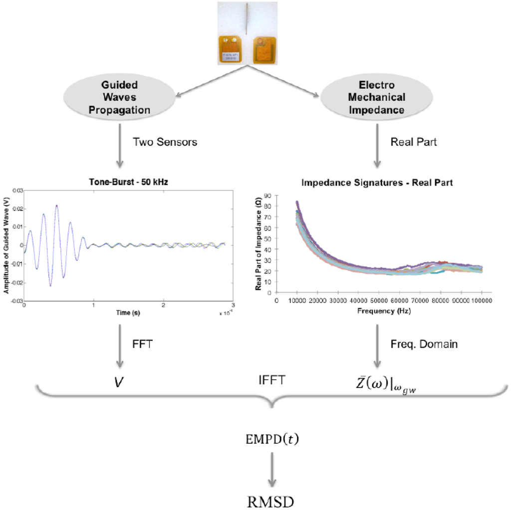 One of the most interesting features of PZT sensors is that they constitute the key element of two of the most studied and successful NDT techniques nowadays: the EMI method and guided waves. However, even though these two methodologies have demonstrated great performance, few efforts have been made so far, at least to the knowledge of the authors, in the development of an integrated method that can combine both impedance signatures and guided waves in order to take advantage of the whole potential of these smart sensors. One of the few studies addressing this challenge is found in [18], where An et al. proposed an integrated damage diagnosis procedure based on those two different signals. However, in that study, impedance signatures and guided waves were treated separately so that two different damage indicators were obtained, both of them being weighted and accordingly combined afterwards in order to achieve a unique and integrated damage indicator. In this sense, the work presented in this paper aims to achieve a more integrated combination of the physical properties of both kinds of signals into a single one. By doing this, the necessity of weighting different damage indicators would be avoided, and thus the damage identification might be done with less a priori information.