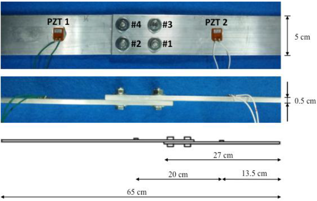 The first test was carried out on a lab-scale bolt jointed aluminium specimen consisting of two beams, the first one with dimensions of cm3 and the second one with dimensions of cm3, connected by four bolts with a diameter of 10 mm (Figure 2). Two identical P-876 DuraAct Patch Transducers [35] were bonded to both sides of the lap joint at a distance of 20 cm between them by using an epoxy adhesive. The purpose of this test was to evaluate the ability of the proposed approach to detect the damage due to loose bolts by inducing the following four stages or damage scenarios in the analyzed specimen: (a) No damage (D0), for which five different and independent measures were taken and used as raw data (D1 to D5); (b) Damage 1 (D1): Loose bolt #3 by one half-cycle; (c) Damage 2 (D2): Loose bolt #3 by another half-cycle; (d) Damage 3 (D3): Loose bolt #2 by one-half-cycle. It is important to remark here that all the necessary measurements were taken one after another for each subsequent damage condition. In this way, for the D0 condition, both impedances and guided waves were initially measured. Once these measurements were collected, damage D1 was induced and the new stage was measured and so on.
