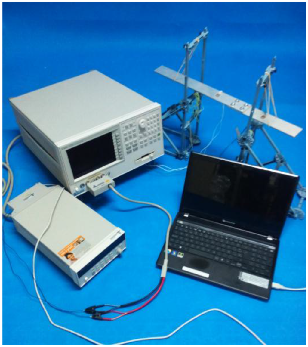 The two PZT sensors were individually connected to two different channels of the 3499B multiplexor, which was used to make a multiple connection between the HP 4192A Impedance Analyzer and the PZT sensors. Both, the multiplexor and the impedance analyzer were from Agilent Technologies. To measure the impedances at each sensor, a sinusoidal sweep voltage with a 1 volt amplitude was applied to the PZT sensors over a frequency range of between 10 kHz and 100 kHz. Five impedance signatures were measured for each damage case, so the raw data were obtained by averaging the responses of five measurements. Figure 3 shows the overall experimental setup for the impedance measurements.