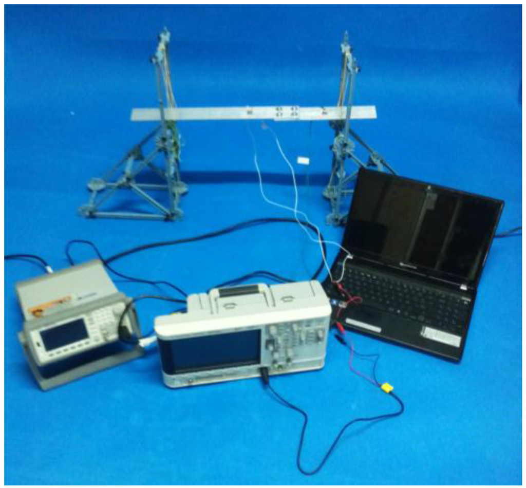 Once all the impedance data were collected at each damage step, each sensor was afterwards and alternatively connected to the guided waves system, which consists on the following components: a waveform generator that sends the selected waveform to the structure in the form of an input excitation on the first sensor, an oscilloscope to register the response of the structure on the second sensor, and a conventional laptop controlling both of them (Figure 4). Both the waveform generator and the oscilloscope were acquired from Agilent Technologies. In this test, the same 10-cycle tone-burst was sent in all cases at 50 kHz with a peak amplitude of 10 volts, and five time signals were measured and averaged. Finally, a bandpass filter with 1 kHz and 500 kHz low and high cutoff frequencies was used to improve the quality of the guided signals.