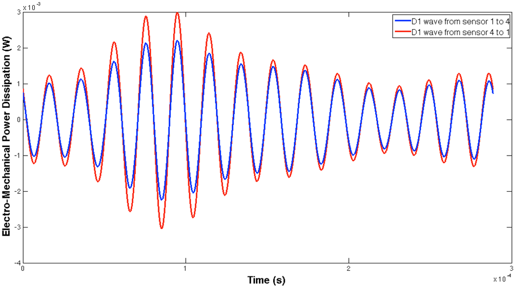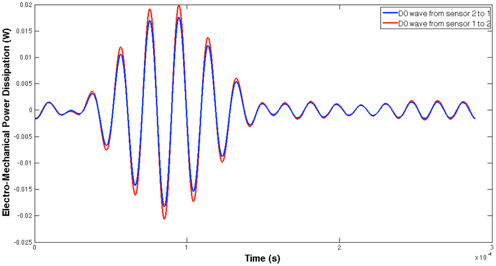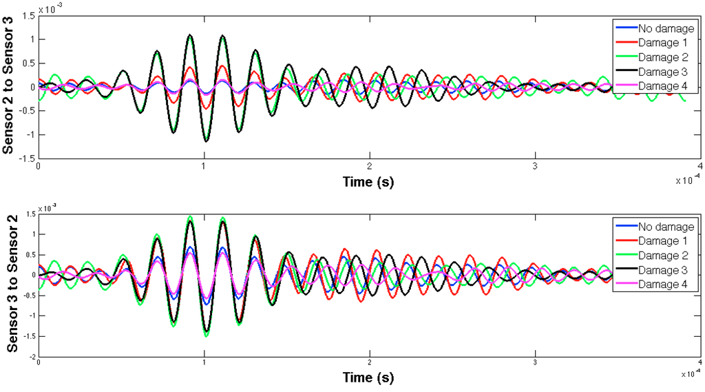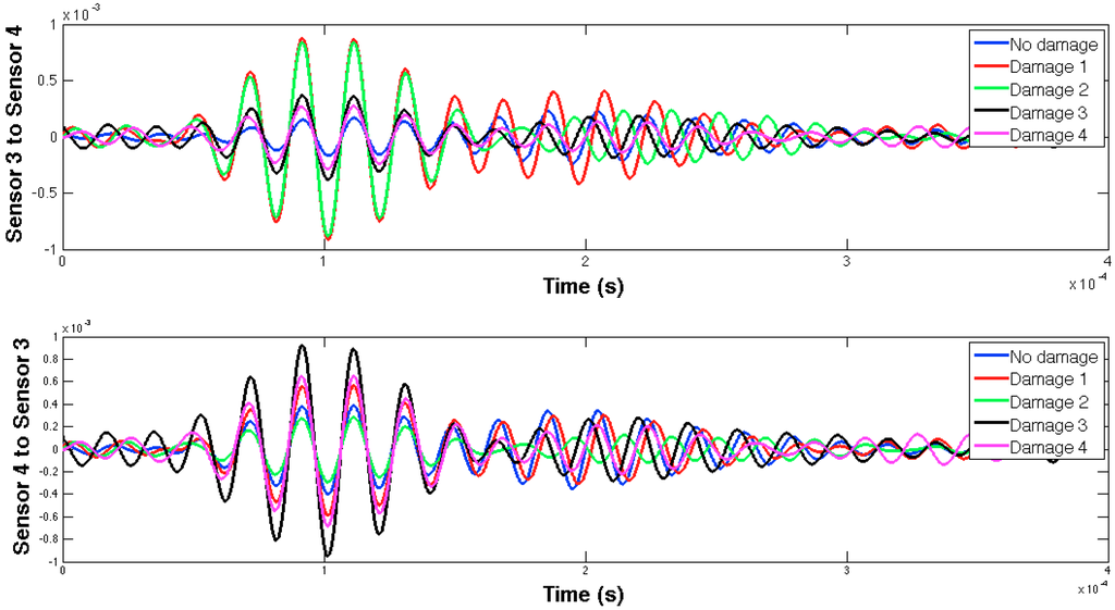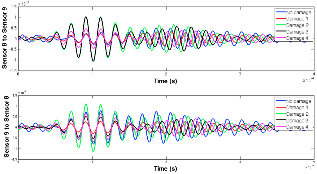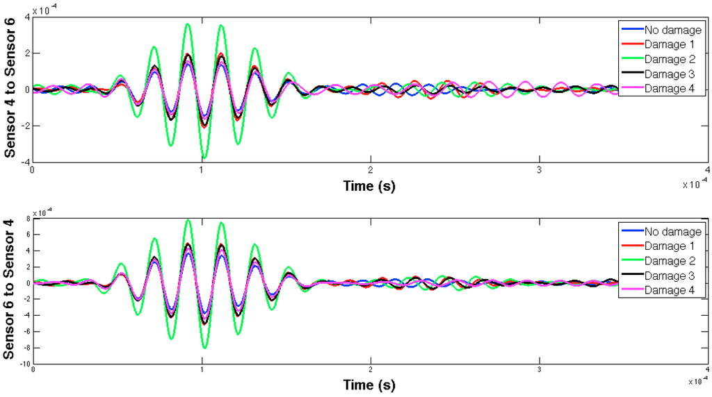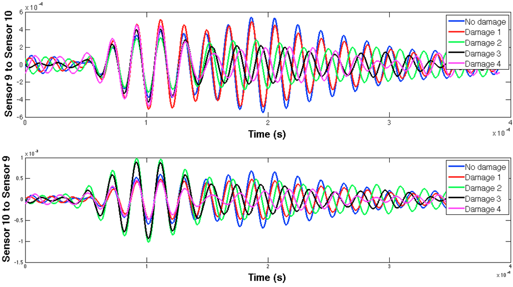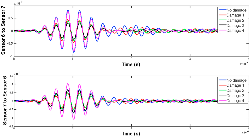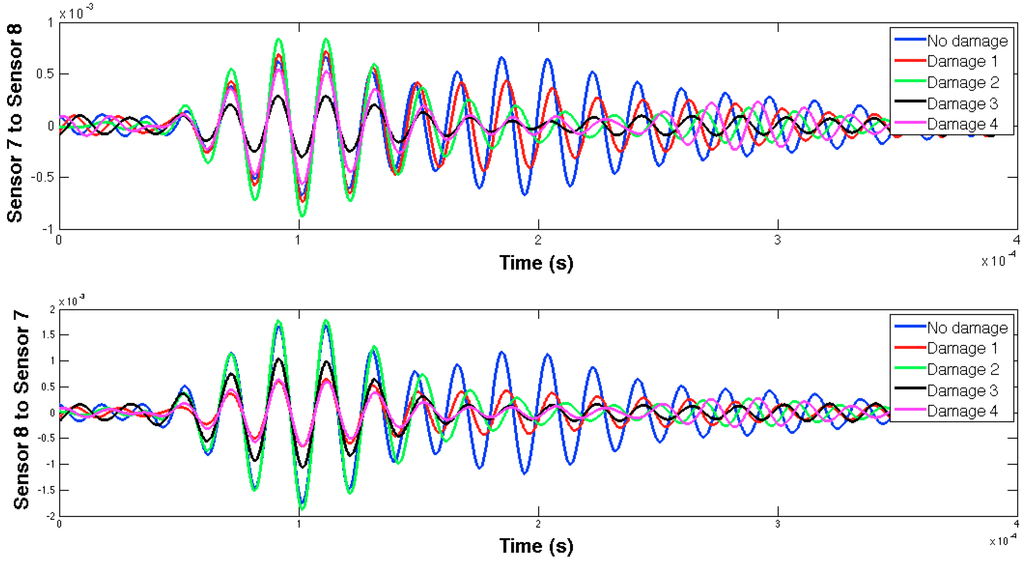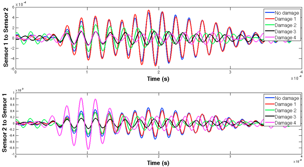 Figure 5 and Figure 6 show, respectively, the EMPD obtained when the guided tone-burst is sent from sensor 1 to sensor 2, and vice versa. As can be immediately verified from these figures, there is a visible variation in the EMPD every time new damage is induced in the bolt-jointed aluminium beam, which indicates that the EMPD is sensitive to the presence of, at least, this kind of damage in this sort of lab-scale structures. Furthermore, this variation in the EMPD, which appears to be affecting the amplitude of the measured signal, is not exactly the same in both figures, since it slightly depends on the wave direction. This conclusion might not be too obvious to extract from these figures, but it is quite easy to check by a simple comparison between the corresponding arrays of output data at each damage level. An example of this is shown in Figure 7 for damage D0 and the wave travelling in both directions. Nevertheless, further information might be extracted if Equation (4) is used to translate these data into a damage indicator.