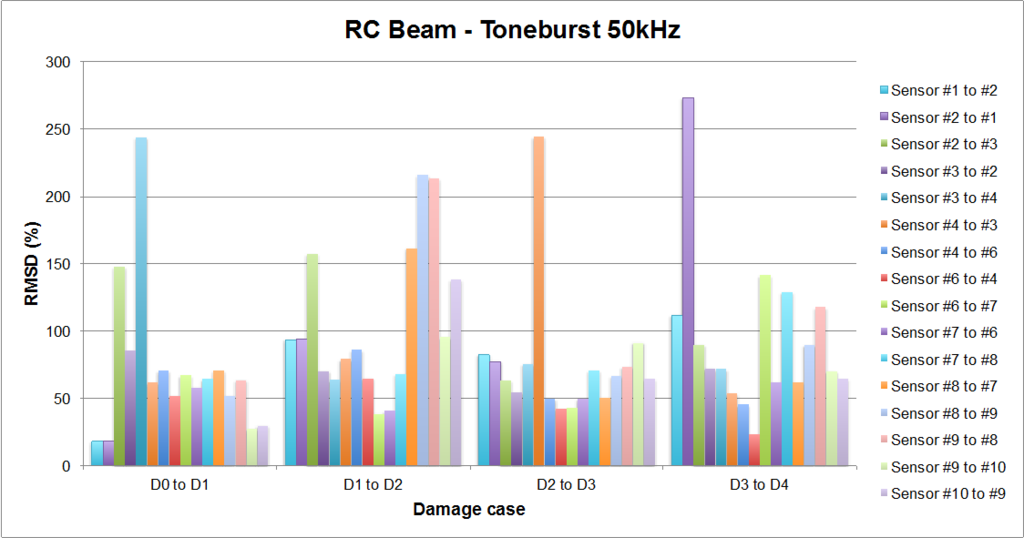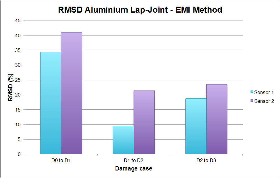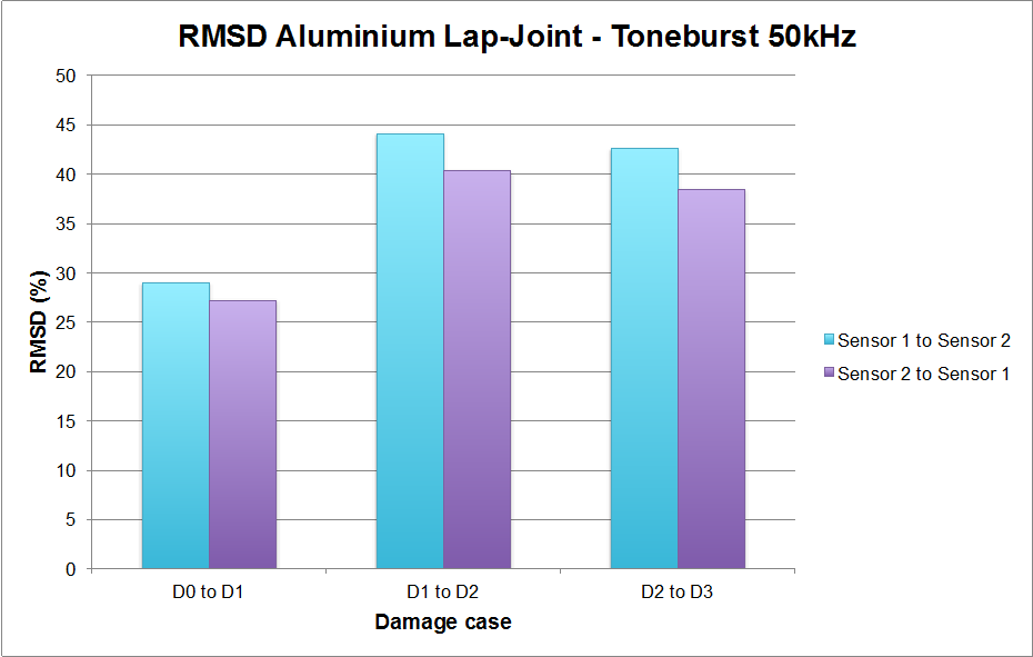Figure 8 shows the computed values of the RMSD corresponding to the two previous figures, one value per damage stage and wave direction. As commented above, this figure shows a clear sensitivity to the appearance of damage in all cases. Nevertheless, a clear difference cannot be found between single and multiple damage scenarios. In the two single damage scenarios, D1 and D2, the RMSD is higher when the tone-burst travels towards sensor 2 (1.78% higher for D1 and 3.7% higher for D2, where damage is more severe), and this sensor turns out to be the one closer to the induced damage (bolt #3). From this statement it is tempting to extract the general conclusion that the variation in the EMPD will be higher when the damage is closer to the sensor in which the tone-burst is received, and this might work in that way for all single damage scenarios, but it is certainly not true when addressing the case of a multiple damage scenario (D3). In this case, even though there is new damage induced close to sensor 1 (bolt #2), the RMSD calculated in the other direction is still higher, which clearly contradicts the conclusions from the single damage scenario. However, this might make sense given that the damage severity at bolt #3 is higher than the new damage at bolt #2. Also, considering the proximity between the two bolts makes the process more difficult.
