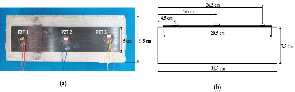 The second test was carried out over a concrete specimen with dimensions cm3 which was strengthened with an external FRP strip, with dimensions cm3, bonded by using an epoxy resin adhesive. Three identical P-876 DuraAct Patch Transducers from Piceramics [35] with the thickness of 0.5 mm were symmetrically bonded along the length of the specimen using the same epoxy adhesive as before (Figure 10). The overall experimental setups for the measurements are the same as the ones shown in Figure 3 and Figure 4, and the same measurement conditions were imposed on both the impedance signatures and the guided waves.