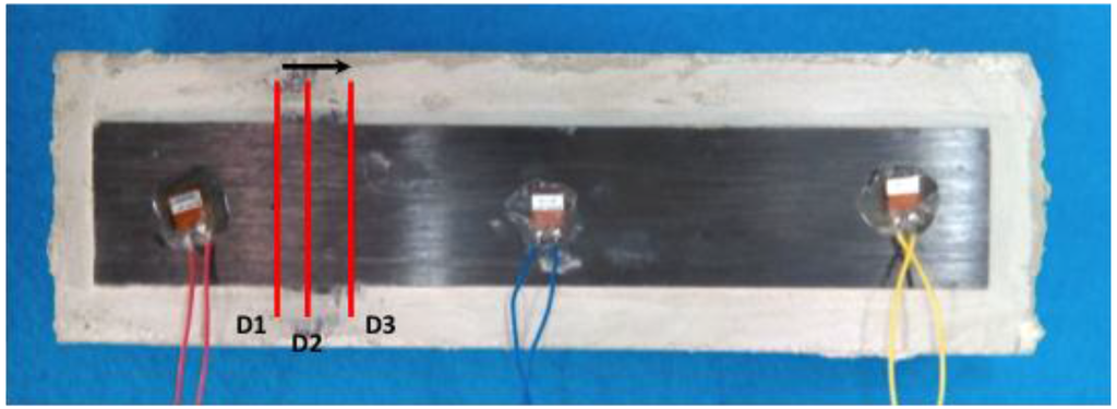 Finally, in the D3 damage case, the RMSD values are much higher when the EMPD is calculated from the measurements at sensor 2, which, according to the reasoning proposed in this paper, would erroneously mean that this damage is much closer to sensor 2 this time, given that the maximum extent of this hole reached the midpoint between the two sensors. Nevertheless, considering just the RMSD values calculated when the guided wave travels towards sensor 1, it is quite clear that the value corresponding to each of the damage cases is lower each time, which suggests that the new debonding between the concrete and the FRP is further each time from this sensor, as can be verified from Figure 12. Taking into account again the expression defined in Equation (4) for the RMSD indicator, the values computed between D2 and D3 stages should only capture the new debonding practiced at the interface from the D2 stage.