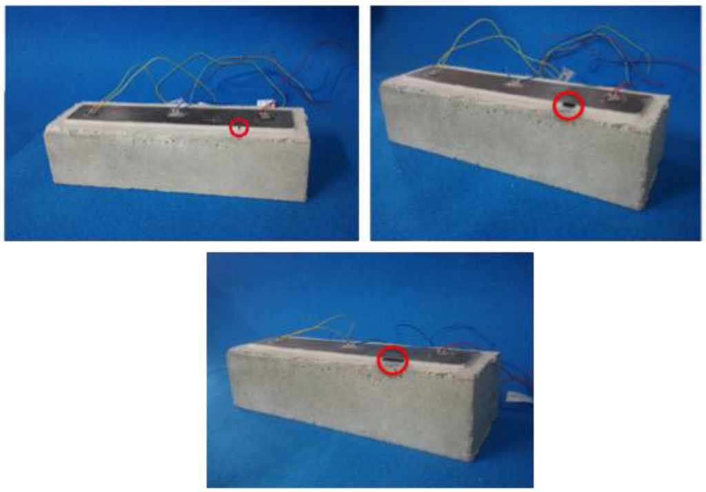 The purpose of this final test was to simulate, over a lab-scale concrete specimen, the debonding failure mode that usually comes up in real structures strengthened with FRP strips. In order to detect that failure through the application of the proposed method, the following four stages or damage scenarios were induced (all by means of holes drilled in the resin adhesive) in the analyzed specimen: (a) No damage (D0); (b) Damage 1 (D1): a 5 mm debonding located 7.25 cm away from the left end of the specimen; (c) Damage 2 (D2): amplification of the debonding practised in the previous stage towards the PZT number 2, up to a total debonding length of 1 cm; (d) Damage 3 (D3): repetition of the previous step up to a total debonding length of 2.5 cm (Figure 11 and Figure 12).