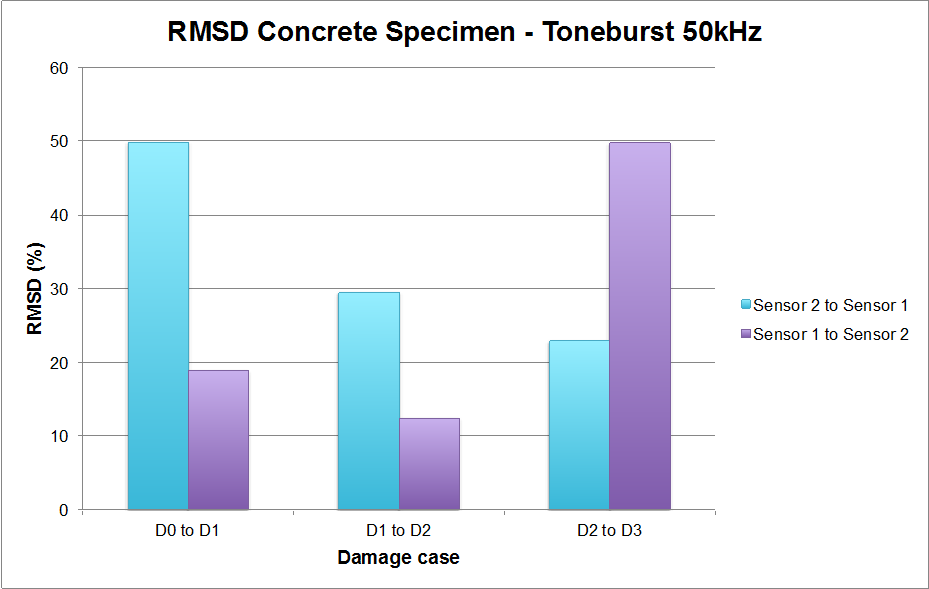 In this test, a continuous damage scenario is studied. It cannot be considered either a single or multiple damage scenario in the same sense as in the previous example, since it is not possible to specify the location of each damage at a particular position. From the initial location of damage (case D1) defined at the concrete-FRP interface, an extension towards sensor 2 was practised for the other two damage cases, D2 and D3, with the purpose of increasing the severity and extension of the damage. As seen in Figure 16, the RMSD for D1 is higher when the guided wave travels towards sensor 1 (49.84% vs. 18.87%), which means, according to the conclusions extracted in the previous example, that the damage D1 is close to this sensor, as it actually is (Figure 11). Furthermore, from the noticeable difference in the RMSD values for this case, given that if the guided wave travels in the opposite direction the value is 30.97% lower, it is reasonable to say that the distance between the damage position and sensor 1 is much lower than that between the damage and sensor 2, which turns out to be true.