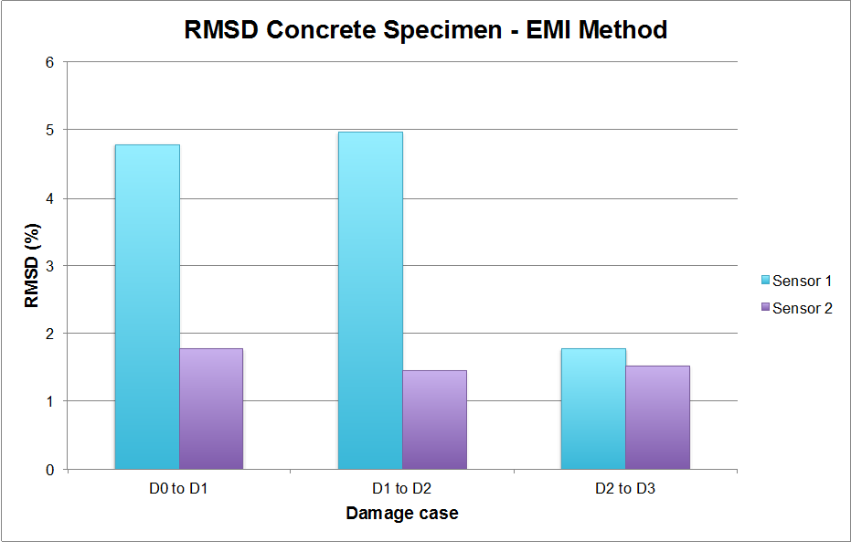 By making a comparison, as in the previous example, with the RMSD obtained by applying the traditional EMI method, shown in Figure 17, it is even clearer in this case that the proposed methodology is quite more sensitive to damage than the traditional EMI method. Furthermore, it might be true that the proposed methodology fails in the localization of damage D3, but the values of the RMSD shown in Figure 16 are more representative of the real damage present in the concrete specimen after inducing D3, which is actually the biggest damage induced in this example (see Figure 12). In comparison to the damage found by the EMPD, the values obtained with the traditional EMI can be considered negligible, so even the conclusions about damage location cannot be taken into account. In terms of RMSD differences between sensors 1 and 2 at each damage stage, it is clear as well that damage conclusions are much more evident by using the EMPD.