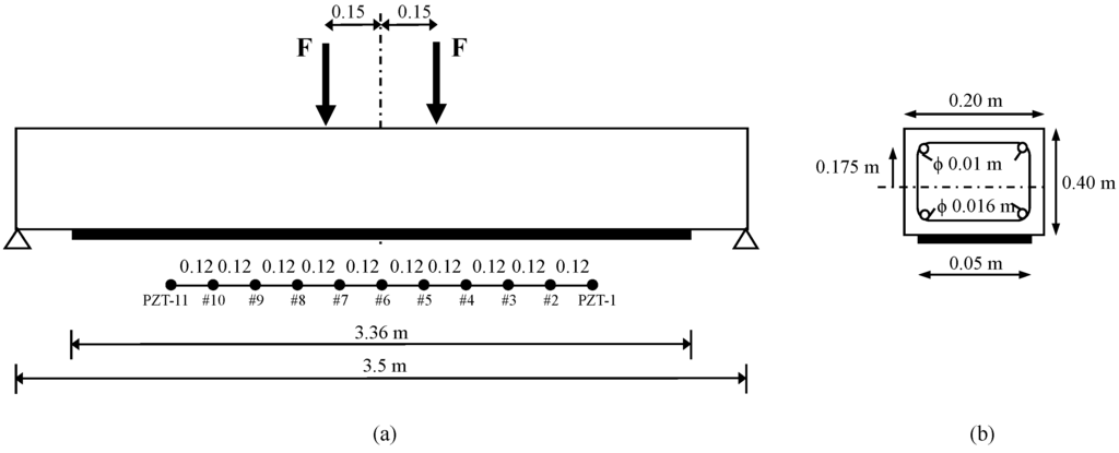 (a) Geometry, loading scheme, and sensor location map for the RC beam; (b) Cross-section of the beam.