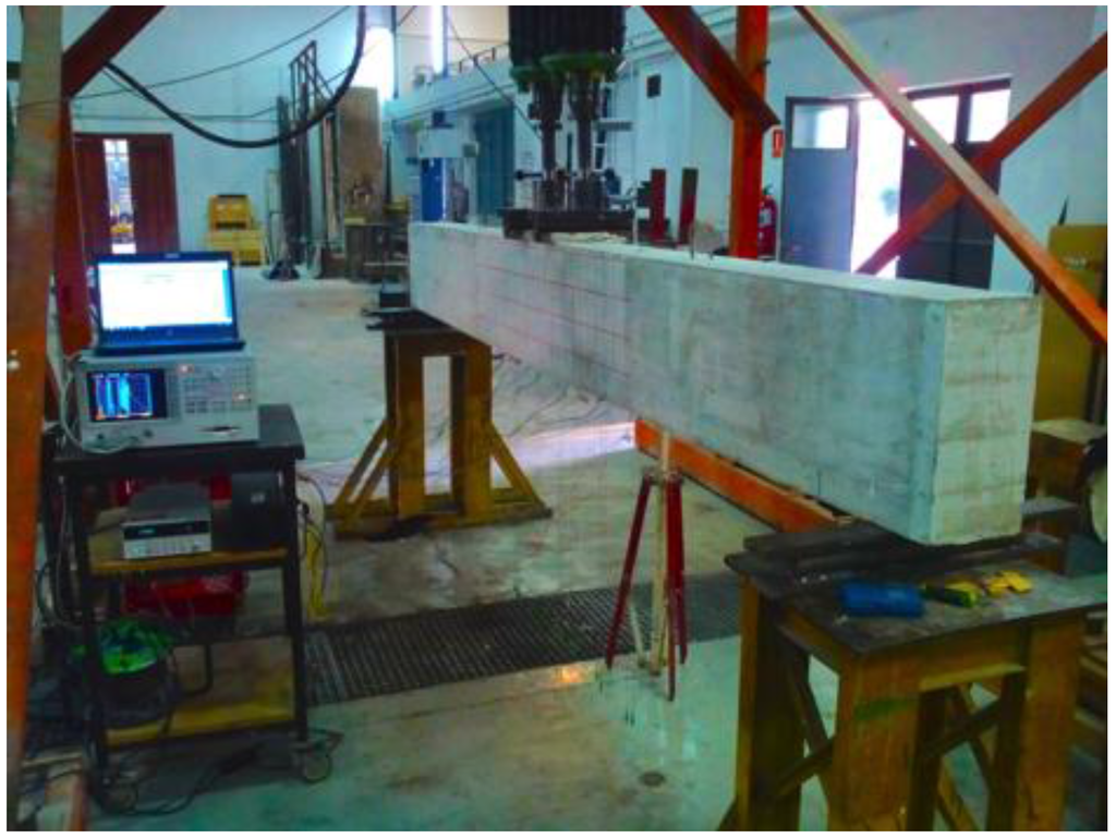 A third experimental study was carried out to test the feasibility of the proposed approach when applied to a real-scale complex structure, such as that corresponding to a reinforced concrete beam externally strengthened with an FRP strip. The failure mode of this kind of structure is critical because it is usually due to the sudden and brittle debonding of the FRP reinforcement originating from an intermediate flexural crack [36,37,38]. Detection of debonding in its initial stage is essential to prevent future failure, which might be catastrophic.