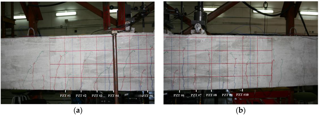 Cracking map of the beam after the last loading stage. (a) Left side of the beam; (b) right side of the beam.