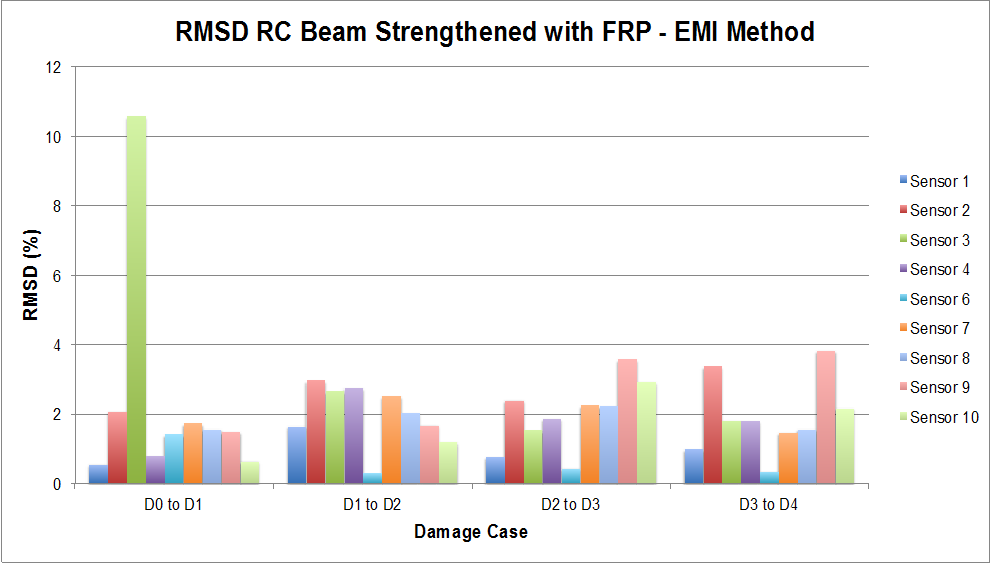 Finally, the EMPD has also been demonstrated to be sensitive to damage in a real and complex structural system such as the RC beam externally strengthened with FRP. In this case, extremely high sensitivity has been demonstrated even to minor damage at a very early stage of the loading procedure, which means that early detection can be successfully performed.