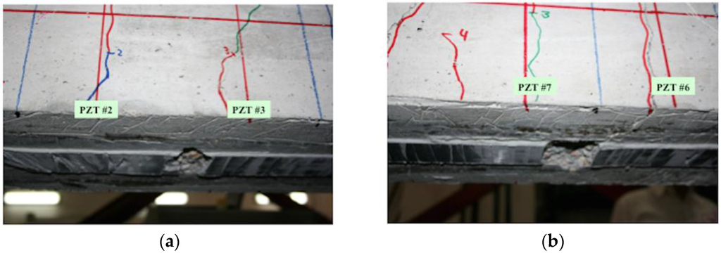 Damages with concrete cover separation between sensors 2 and 3 (a) and sensors 6 and 7 (b) for the RC beam.