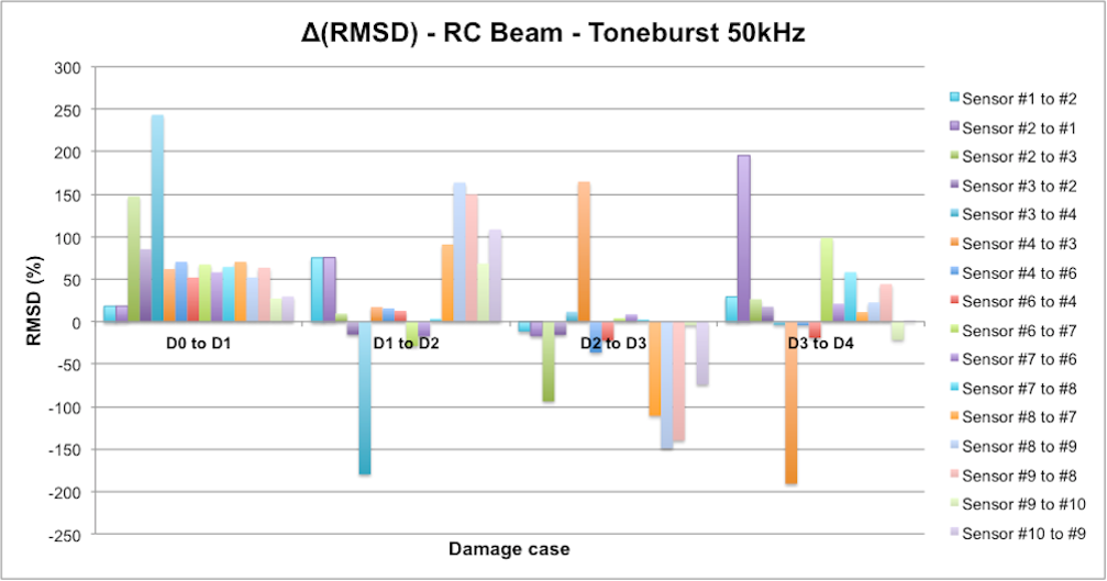 Each of the graphics shown in Figure 20 demonstrates the presence of the series of damage stages generated in the RC strengthened beam, and it is even possible to discriminate which one could have a higher impact on each sensing region. However, this is just a qualitative analysis of a really complex damage scenario, as shown in Figure 28. Thus, a better understanding will be achieved through the analysis of the RMSD values, as in the previous examples. These values are presented in Figure 29.