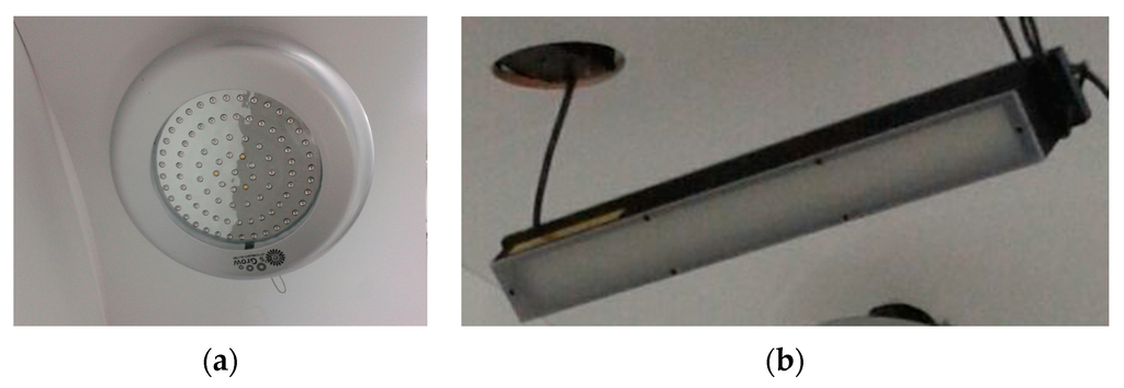 The daytime LED panel is formed by a combination of five types of LEDs emitting wavelengths with peaks in UV light (290 nm), blue light (450 and 460 nm) and red light (630 and 660 nm). The LED panel has a power of fifty watts. It is usually used for indoor growing of crop plants. The merging of wavelengths produces an illumination with a pink-red appearance (Figure 2a).