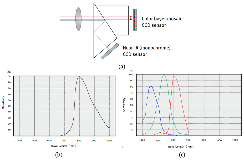 Capture subsystem (a) Prism between lens and CCDs; (b) Camera NIR-IR response; (c) Camera RGB response.