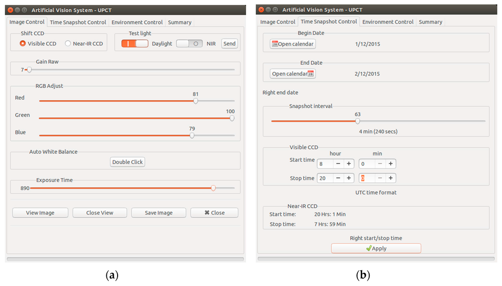 Graphical User Interface for capture subsystem: (a) Image control tap; (b) Time control tab.