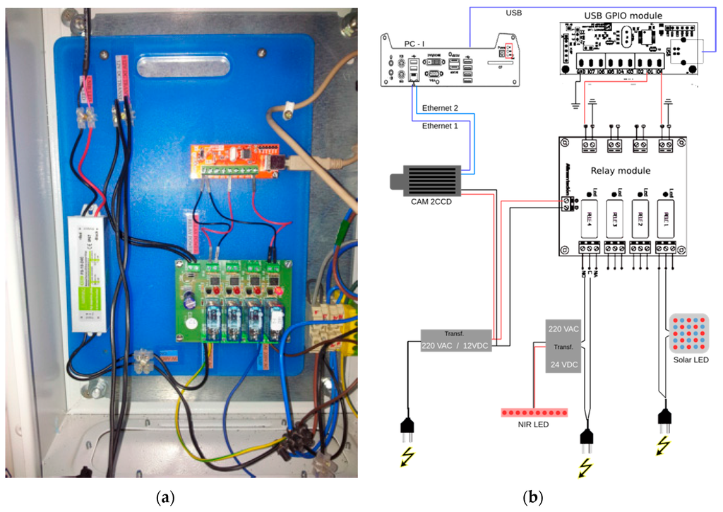 The second component was the optocoupler relay module. It had four optocoupled outputs, optocoupled to a relay triggering at voltages between 3 and 24 V. Both day light and night light LEDs were connected to two relays (Figure 5b), in such a way that the configuration via the control software dictates the beginning of image acquisition, triggers light turning on or off coordinating the light pulses with the camera during the day and night.