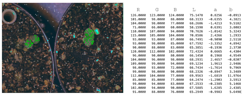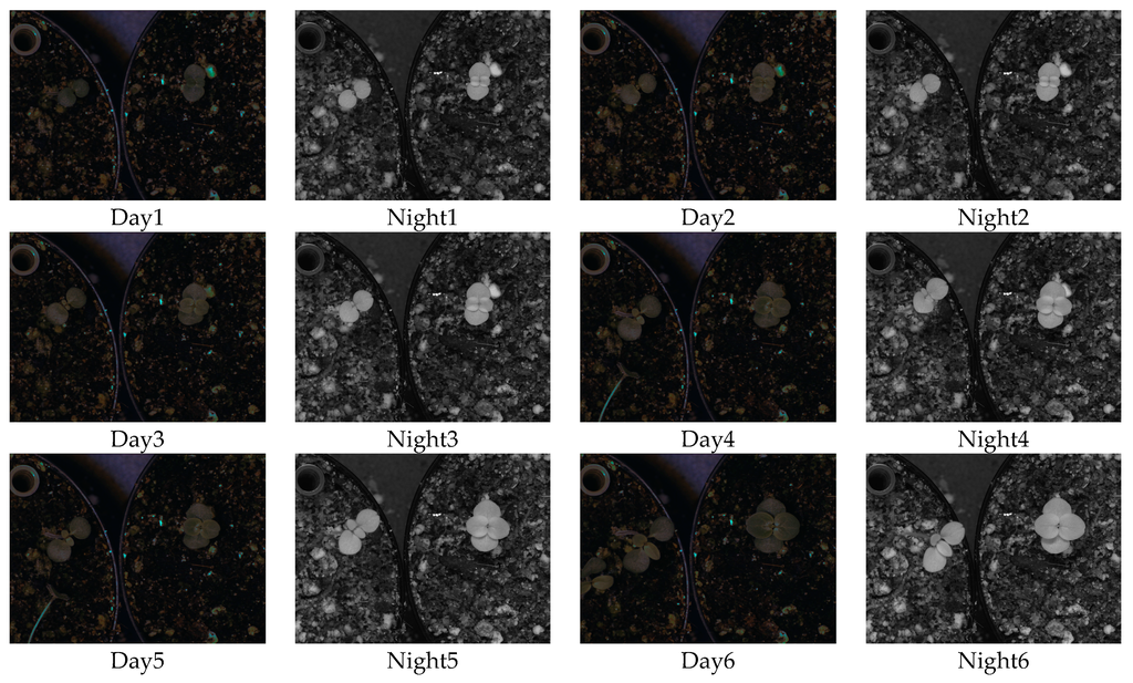 Figure 8 shows two images from each day of the experiment for different capture periods. We can distinguish easily the growth stages of the two species during the daytime and night-time.