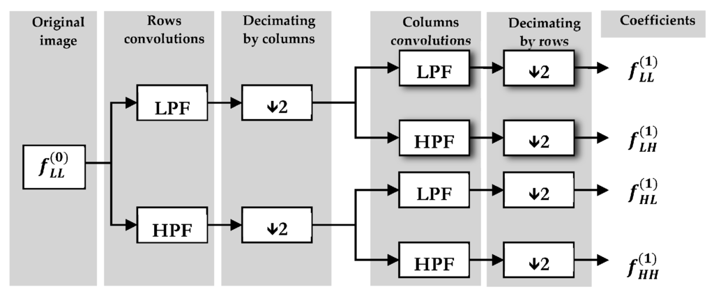 Discrete Wavelet Transformation (DWT) generates a set of values formed by the “wavelet coefficients”. Being f(x, y) an image of M × N size, each level of wavelet decomposition is formed by the convolution of the image f(x, y) with two filters: a low-pass filter (LPF) and a high-pass filter (HPF). The different combinations of these filters result in four images here described as LL, LH, HL and HH. In the first decomposition level four subimages or bands are produced: one smooth image, also called approximation, , that represents an approximation of the original image f(x, y) and three detail subimages , and , which represent the horizontal, vertical and diagonal details respectively. There are several wavelet mother functions that can be employed, like Haar, Daubechies, Coiflet, Meyer, Morlet, and Bior, depending on the specific problem to be identified [34,35]. Figure 7 shows the pyramid algorithm of wavelet transform in the first decomposition level.