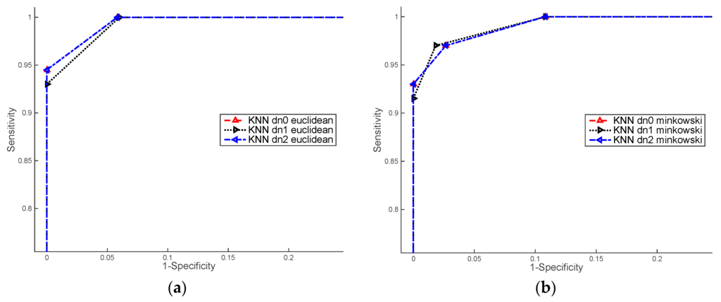 Figure 9 shows ROC curves computed over the set of colour images training. The higher values of AUC were obtained by kNN classifier with Euclidean distance. Concerning the data normalisation, we achieved similar results with raw data and normalisation based on the mode and standard deviation (dn0 and dn1).