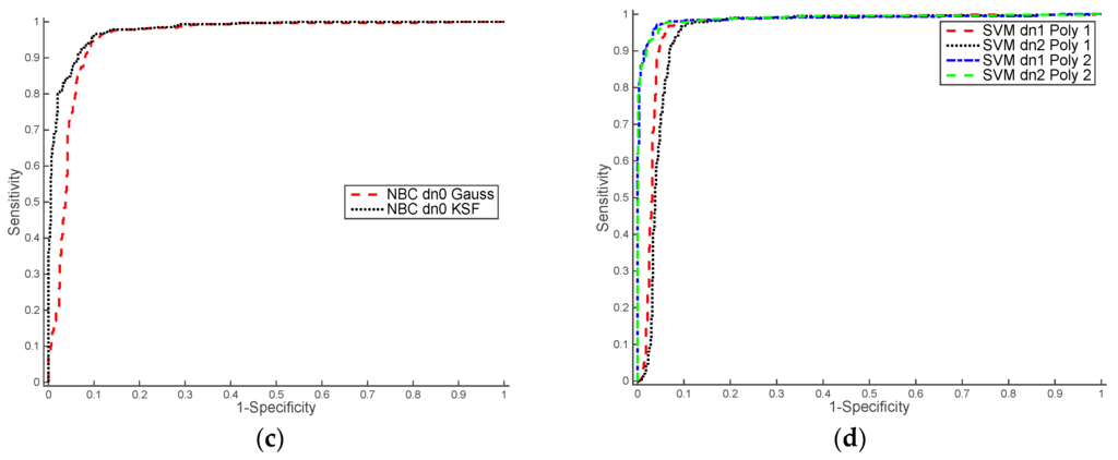Figure 10 shows ROC curves computed over the set of NIR images training. We can observe that the best results were obtained with the SVM classifier with quadratic functions and using a normalised data based on the mean and standard deviation (dn1). Table 3 shows AUC values obtained from ROC curves of the Figure 9 and Figure 10.