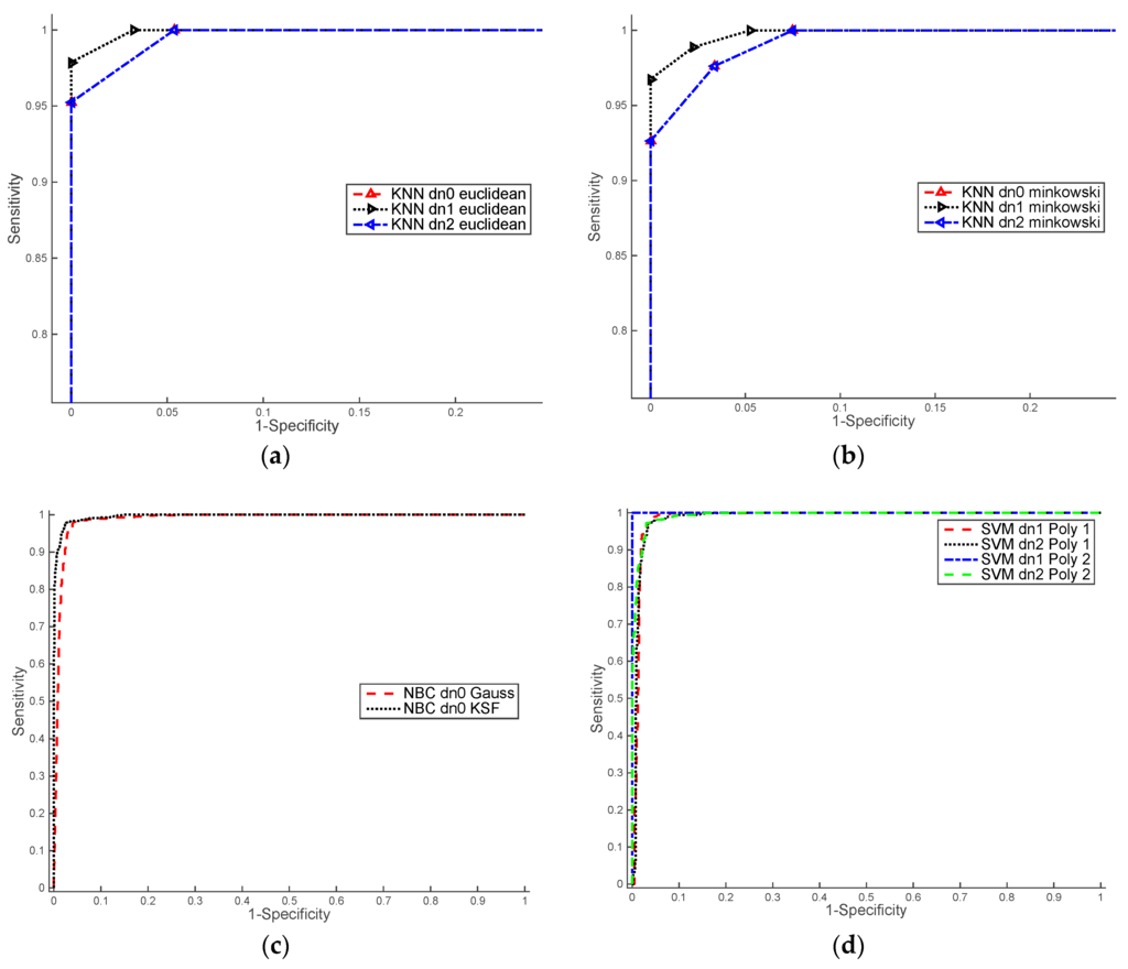 ROC results for training NIR images. (a) kNN classifier with distance Euclidean and data normalisation: dn0, dn1 and dn2; (b) kNN classifier with distance Minkowski and data normalisation: dn0, dn1 and dn2; (c) BN classifier with Gauss and KSF kernels and data normalisation dn0; (d) SVM classifier with lineal and quadratic polynomial functions and data normalisation: dn1 and dn2.