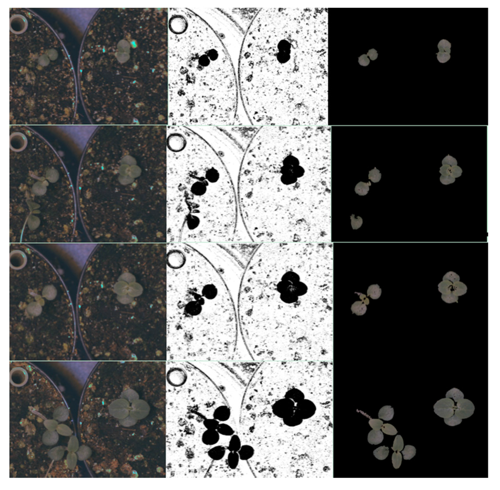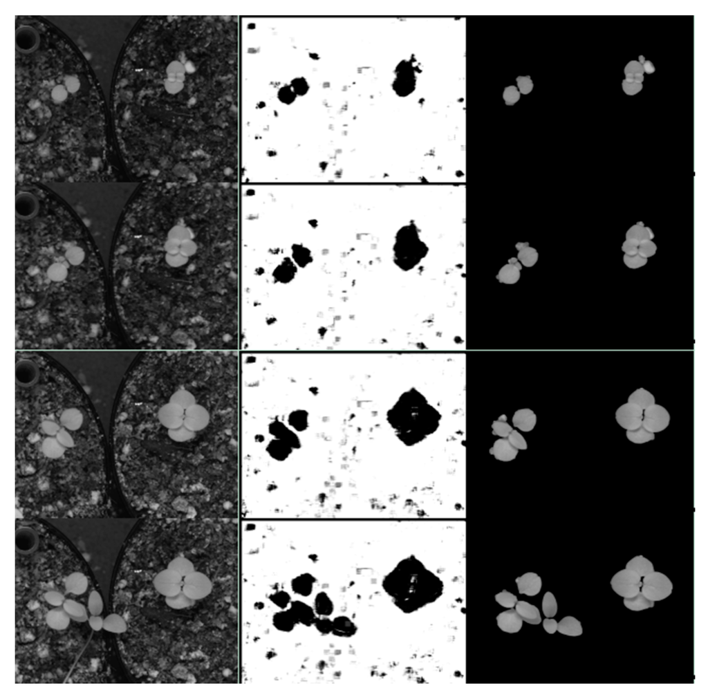 Results of the NIR image segmentation based on SVM. Left shows four NIR images chosen at different growth stages growing during night-time. The second column shows the segmentation results after application of the SVM classifier with quadratic function and with data normalisation dn1. The third column shows the results after post-processing stage.