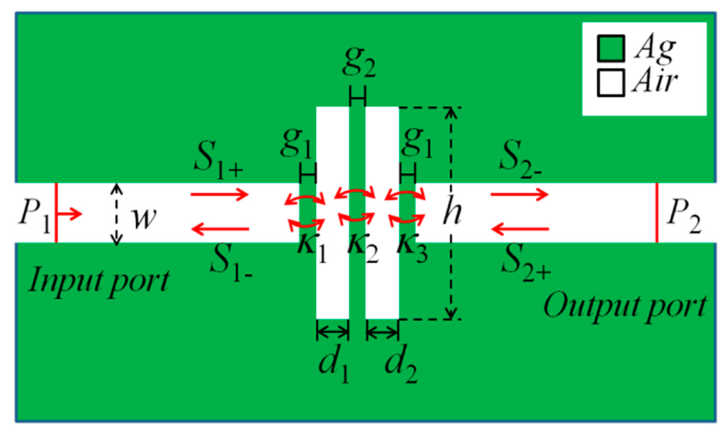 For the MIM waveguide coupled double rectangular cavities system, the temporal coupled mode theory (CMT) [36,37] is utilized to analyze in detail the Fano resonance in this paper. The amplitudes of the SPPs wave of the cavity are denoted by Si ± (i = 1, 2, and 3), and the subscripts ± of Si± denote the input and output from the rectangular cavity (as shown in Figure 1), respectively. When an optical wave with a frequency ω is launched only from the input port of the MIM waveguide (S2+ = 0), the time evolution amplitude Ai ± (i = 1,2, and 3) of the cavity can be expressed as [38]: