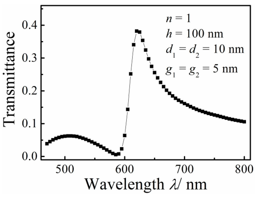 Figure 2 shows the transmission spectrum of the MIM waveguide-coupled double rectangular cavities with d1 = d2 = 10 nm, h = 100 nm, g1 = g2 = 5 nm and n = 1. A resonance peak with asymmetric line shape is observed. The slope of the left shoulder of the resonance peak is obviously larger than that of the right shoulder, which is a typical Fano profile with one maximum and one minimum. The transmittance is near to 0 at the transmission dip (λ = 580 nm). The dip is regarded as a superradiative mode but the peak as a nonoradiative mode.