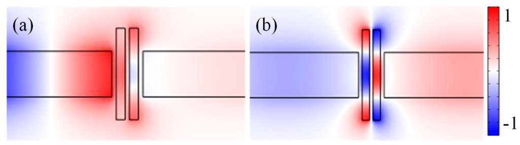 Figure 3a,b display the normalized magnetic field Hz distributions for the transmission dip (λdip = 580 nm) and transmission peak (λpeak = 620 nm) of the MIM waveguide-coupled double rectangular cavities, respectively. For the superradiative mode (λdip = 580 nm), the Hz field distributions show that there is in-phase between the double rectangular cavities. A very weaken coupling occur between double rectangular cavities, and have no SPPs coupled into the right MIM waveguide, which agrees well with the result (κ2 = 0, T = 0) from Equation (8). For the nonradiative mode (λpeak = 620 nm), the Hz fields distribution show that there is anti-phase between double rectangular cavities. The superradiative mode is excited by the SPPs from input waveguide, the nonradiative mode cannot. However, it can be excited by the near-field associated with the superradiative mode. Fano resonances arise from the interaction between the superradiative (discrete state) mode and the nonradiative mode (continuum state).