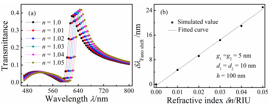 To investigate the sensitivity of the Fano resonance of the proposed nanosensor to n, dielectrics with different n were filled in the MIM waveguides and double rectangular cavities. Figure 4a depicts the transmission spectra of the MIM waveguide-coupled double rectangular cavities with n of 1–1.05 RIU in increments of 0.01 RIU; others structural parameters g1, d, h, and g2 were fixed at 5, 10, 100, and 5 nm, respectively. With increasing n, Re(neff) increased. The Fano resonance peak showed a red shift as n increased. These Fano resonance peak red shifts can also be explained using Equation (2). The transmission spectra reveal that the transmittance of the Fano resonance peak increased with increasing n. Figure 4b shows the shift of the Fano resonance peak as a function of δn. The solid curves are the linear fittings. The sensitivity δλ/δn of the refractive index sensor is 495 nm/RIU according to Figure 4b, and its FOM is 7.5.