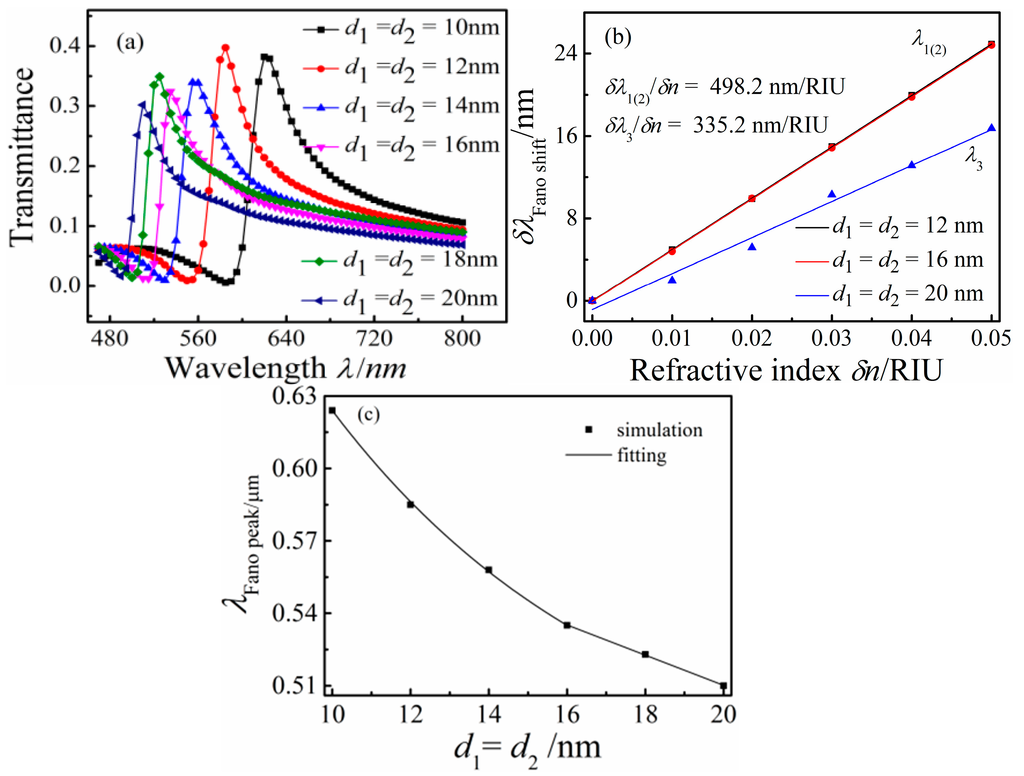 (a) Transmission spectra for different rectangular cavity widths d1(d2); (b) the shift of the Fano resonance peak as a function of the refractive index change δn; and (c) the Fano resonance peak as a function of the rectangular cavity widths change d1(d2).