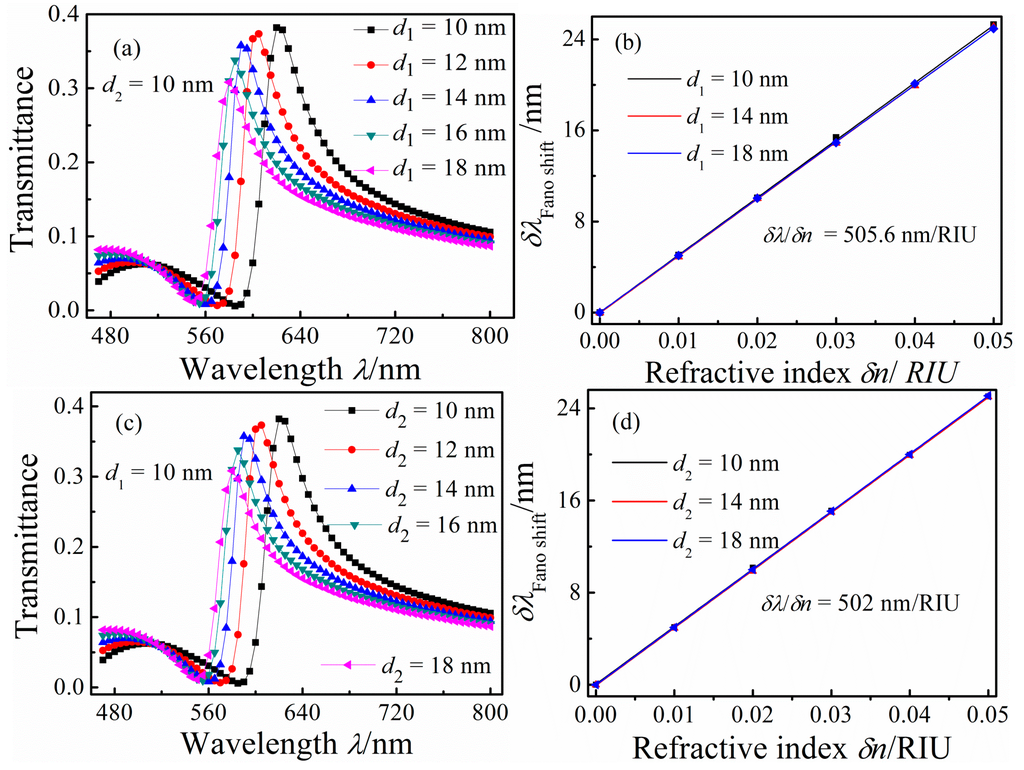 Figure 6a shows that the transmission spectra when d1 is increased from 10 to 20 nm in 2 nm increments with fixed d2 = 10 nm, h = 100 nm, g = g1 = 5 nm, and n = 1 RIU. With increasing d1, the blue shift and the transmittance of the Fano resonance peak decreased slightly. The increase of d1 caused Re(neff) to decrease in the rectangular cavity. Figure 6b shows the shift of the Fano resonance peak δλFano shift as a function of δn, from which we calculated that δλ/δn is 505.6 nm/RIU for this configuration. In addition, we fixed d1 to investigate the effect of varying d2 on the transmission spectra. Figure 6c displays the transmission spectra for systems with d2 = 10, 12, 14, 16, 18, and 20 nm with fixed d1 = 10 nm. With increasing d2, the Fano resonance peak blue shifts and its transmittance decreases slightly. Figure 6d presents δλFano shift plotted as a function of δn for the configurations with different d2; δλ/δn determined from this plot is 502 nm/RIU.