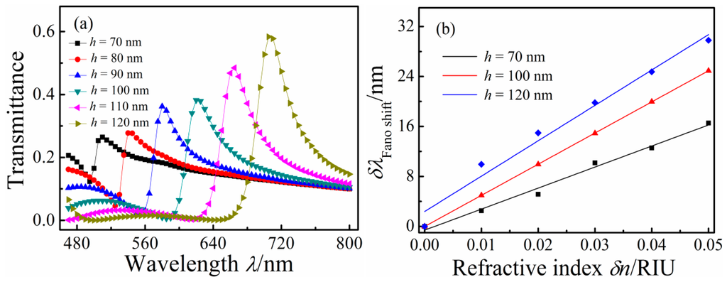 The simulation indicate that the Fano resonance peak as the changing of the refractive index is linear function, and they parallel to each other nearly for different d1 or d2, namely they have same slope. So the refractive index sensitivity δλ/δn curves overlapped each other. To investigate how h affects the Fano resonance of the MIM waveguide-coupled double rectangular cavities, transmission spectra for different height h of 80, 90, 100, 110, and 120 nm with g = g1 = 5 nm, d = 10 nm, and n = 1 RIU were calculated, and are plotted in Figure 7a. With increasing h, the Fano resonance peak red-shifted linearly because the SPPs pathway in the rectangular cavity lengthened, and its transmittance increased. Figure 7b illustrates the shift of the Fano resonance peak as a function of δn for h = 70, 100, 120 nm. The solid curve is the linear fitting. With increasing h, δλ/δn increased. For h = 70, 100, and 120 nm, δλ/δn are 331, 498, and 596 nm/RIU.