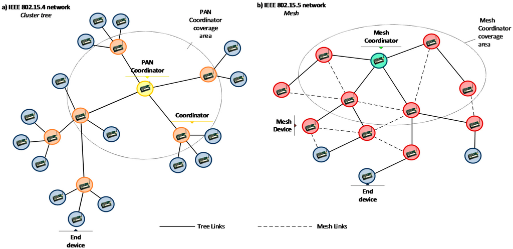 3]. Nodes arranged in a mesh topology are generally easier to deploy and potentially easier to maintain as they are able to reconfigure themselves in order to adapt to the conditions brought by the deployment environment. Among the different mesh solutions available for low-power wireless networks, the low-rate part of the IEEE 802.15.5 (hereafter IEEE 802.15.5) [