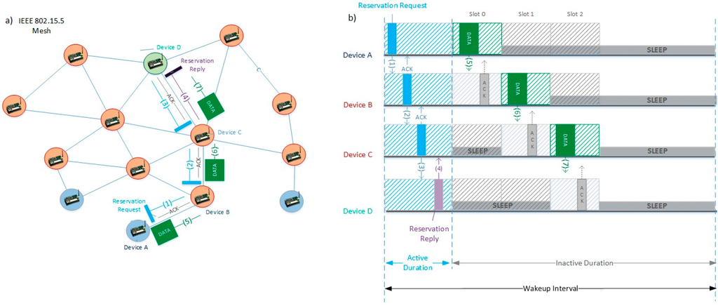Mesh device (router): Unlike the other two types of nodes, mesh devices require two consecutive slots of the inactive period, one for receiving from the previous node and another for transmission to the next node. Consequently, they are the devices that have the highest power consumption.