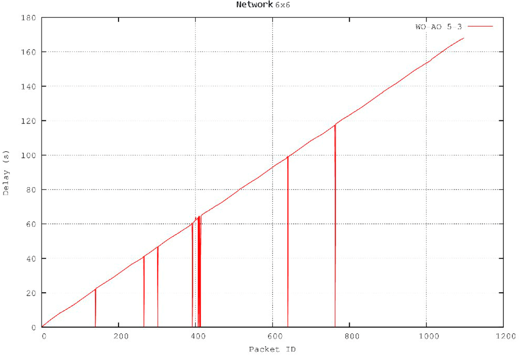 Figure 9) because of the packet service rate of the network (one packet per WI). The figure shows the evolution of the latency calculated after the arrival of each packet for a 6 × 6 network with a 5–3 (WO–AO) configuration. It has to be noted that latency values of zero in the figure represent packet loss.