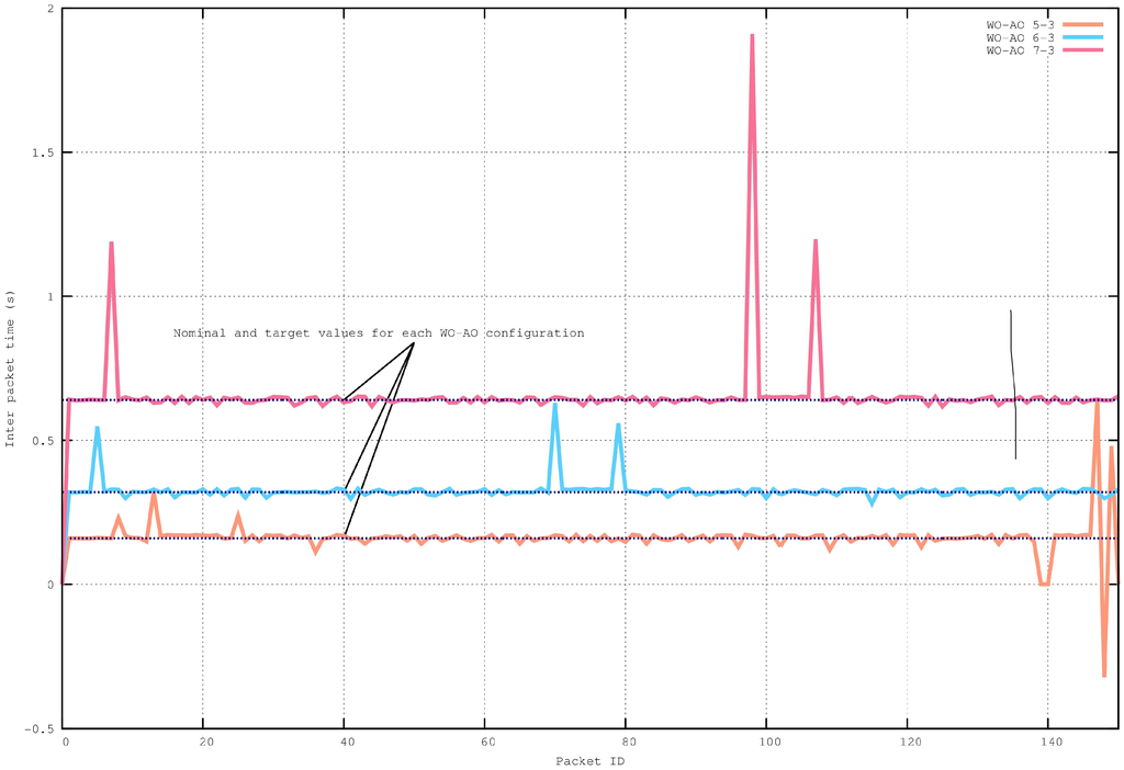 Under these circumstances, for any given WO–AO configuration, the latency increases linearly with respect to the number of transmitted packets (see