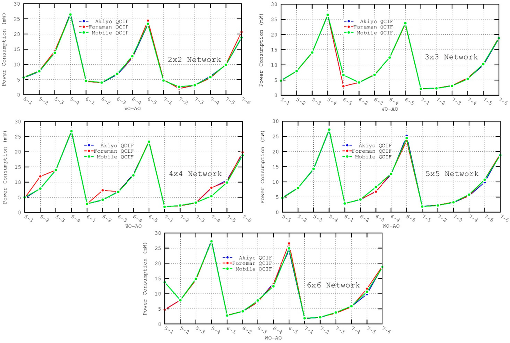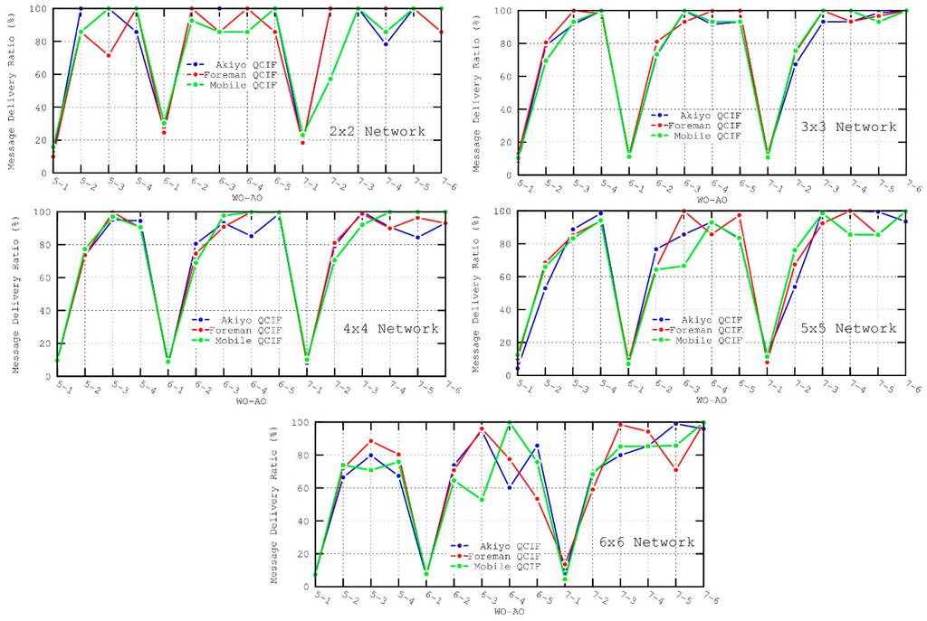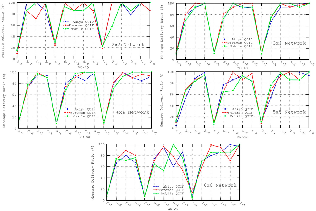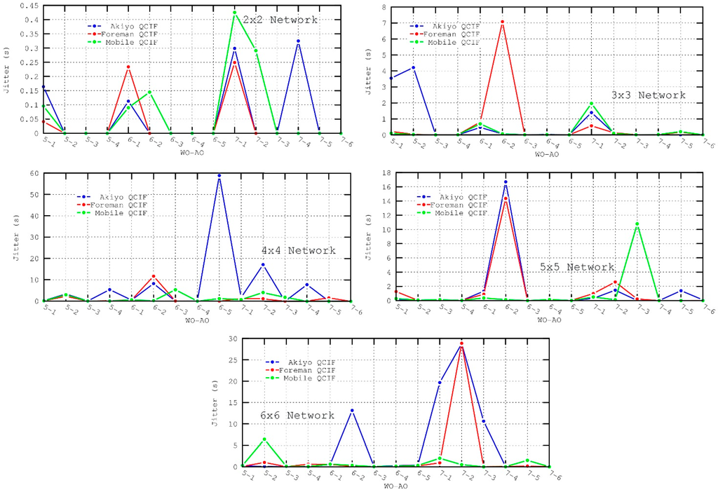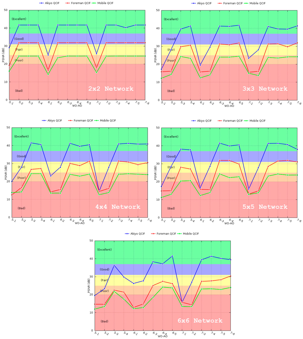 Figure 16, the results of the PSNR for each of the simulated scenarios are shown. In view of the presented results, a degradation in the quality of the video can be observed as the network grows. Besides, the values of WO seem to have some impact for larger networks, 5 × 5 and 6 × 6, but not for small networks. In particular, the PSNR value deteriorates for lower WO values due to the hidden terminal problem. With fixed AO values and therefore fixed