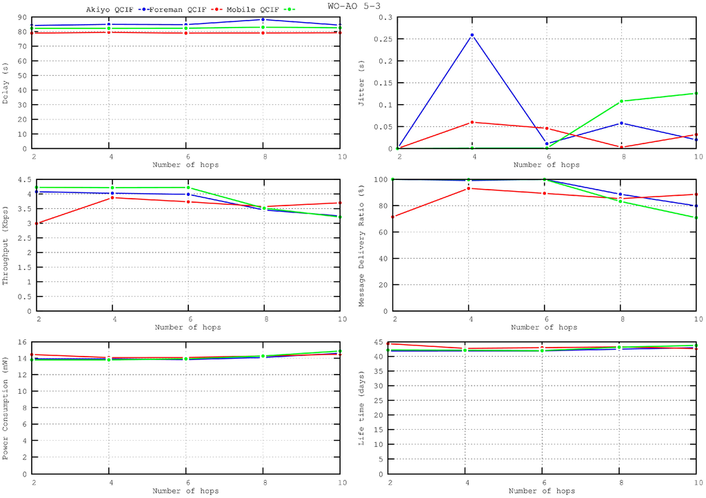 video transmission is feasible. A 5–3 (WO–AO) configuration has been found to be the best for the scenarios studied, although, for larger networks, higher WO values can be considered. The video sequence obtained after the simulation of 5–3 and 7–2 (WO–AO) configurations for Akiyo, Foreman and Mobile QCIF can be found at [