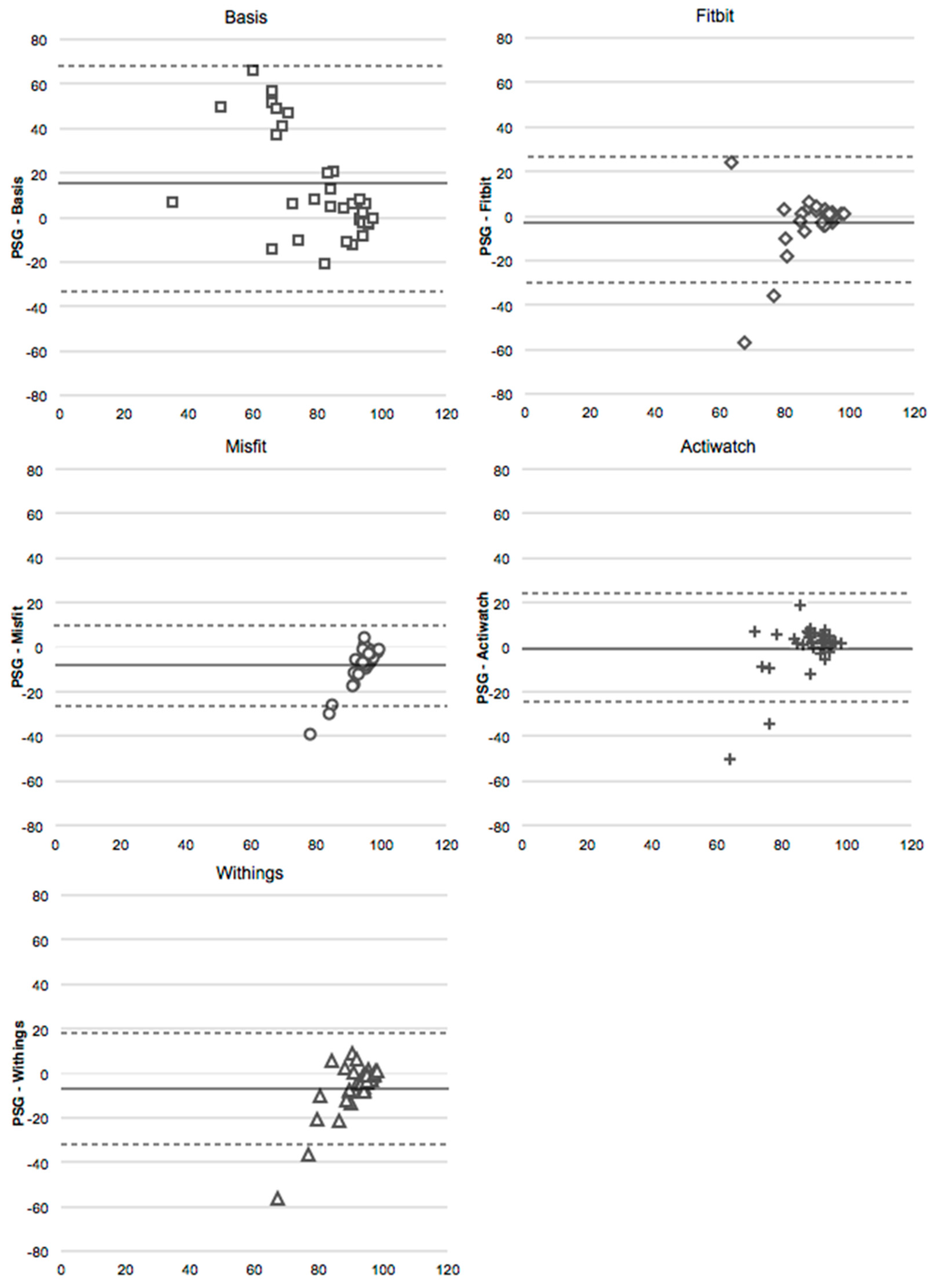 Bland-Altmann plots for sleep efficiency (%) for the Basis, Fitbit, Misfit, Withings, and Actiwatch compared to PSG (adjusted values). The x-axis is the mean of the two devices, and the y-axis represents PSG minus the device. Dotted line represents two standard deviations from the mean.