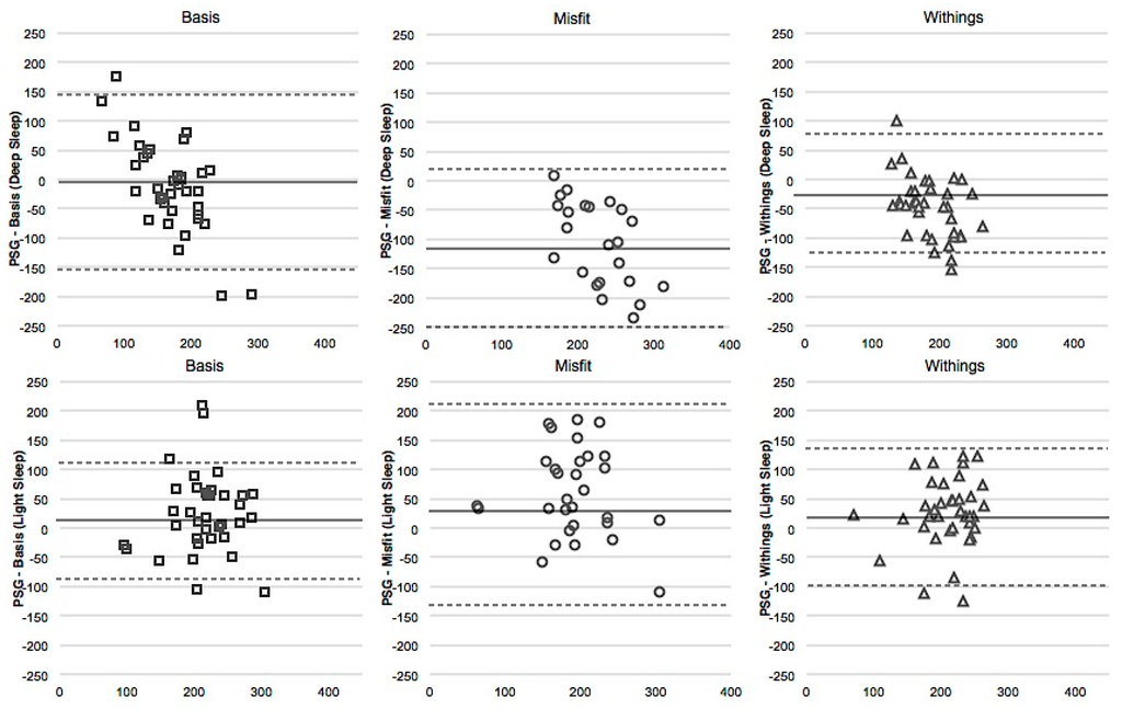 A unique aspect of this study was the assessment of the validity of measures of Light and Deep sleep, a popular output feature of commercially available devices. Light and Deep sleep measures from all tested devices, the Misfit, Basis, and Withings, were not comparable to PSG. Notably, both Light and Deep sleep measures from the Withings correlated with the respective measures from PSG. However, Light sleep was underestimated and Deep sleep was significantly overestimated. The Misfit measure of Light sleep weakly correlated with that from PSG however it was significantly underestimated by over an hour (average bias of 79 min) while Deep sleep was significantly overestimated to an even greater extent (average bias of 107 min). Measures of Light and Deep sleep from the Basis showed little evidence of reliability.