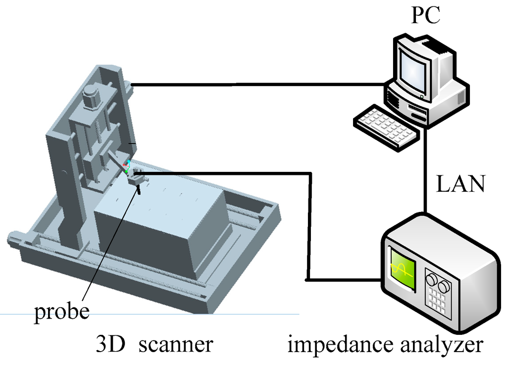The automated experimental setup developed for eddy current characterization of defects is composed of an impedance analyzer, a probe, a 3D scanner and a PC, as shown in Figure 1. The probe is a packaged air-cored coil. It has an inner diameter of 4.0 mm, outer diameter of 4.8 mm, height of 5.0 mm and 300 turns, respectively. The WK65120B impedance analyzer (Wayne Kerr Electronics, West Sussex, UK) which nominally has a broad bandwidth ranging from 20 Hz to 120 MHz and 0.05% basic measurement accuracy, is used to obtain the impedance of the probe. The PC acquires probe signals from the impedance analyzer through the LAN. The 3D scanner is controlled by pulse width modulation (PWM) signals from a PCI-bus card MPC08 with an application developed in Labview (Leetro Automation Co., Ltd., Chengdu, China) and installed in the PC. A pulse from PWM signals can drive a step motor to rotate a fixed angle. Therefore, the displacement and the speed of the 3D scanner are proportional to the number and frequency of the pulses fed into the motor, respectively.