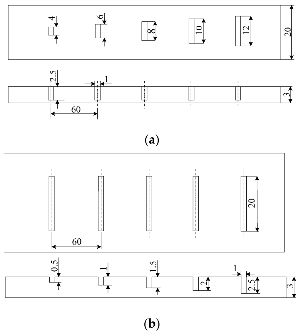 Two Al alloy specimens were prepared, and ten artificial slots were manufactured by electrical discharge machining (EDM) for training and test datasets, as illustrated in Figure 2. Geometrical parameters of the manufactured defects are listed in Table 1. Both of the samples have a thickness of 3.0 mm. The defects in sample 1 have a constant depth of 2.5 mm and lengths with values 4.0, 6.0, 8.0, 10.0 and 12.0 mm. The defects in sample 2 have depths ranging from 0.5 mm to 2.5 mm in steps of 0.5 mm with a constant length of 20.0 mm. All the fabricated defects have a uniform width of 1.0 mm.