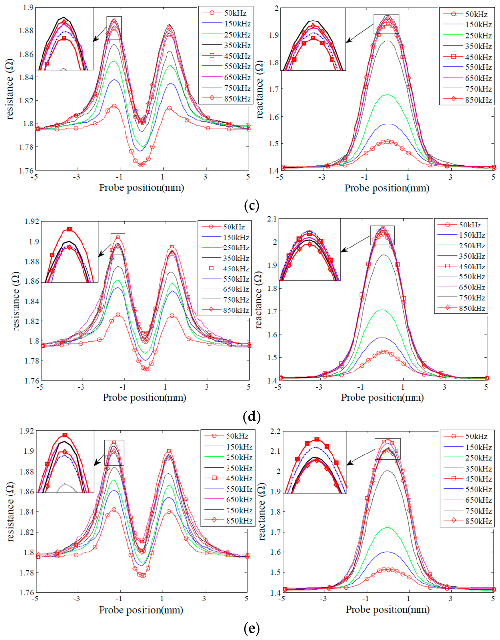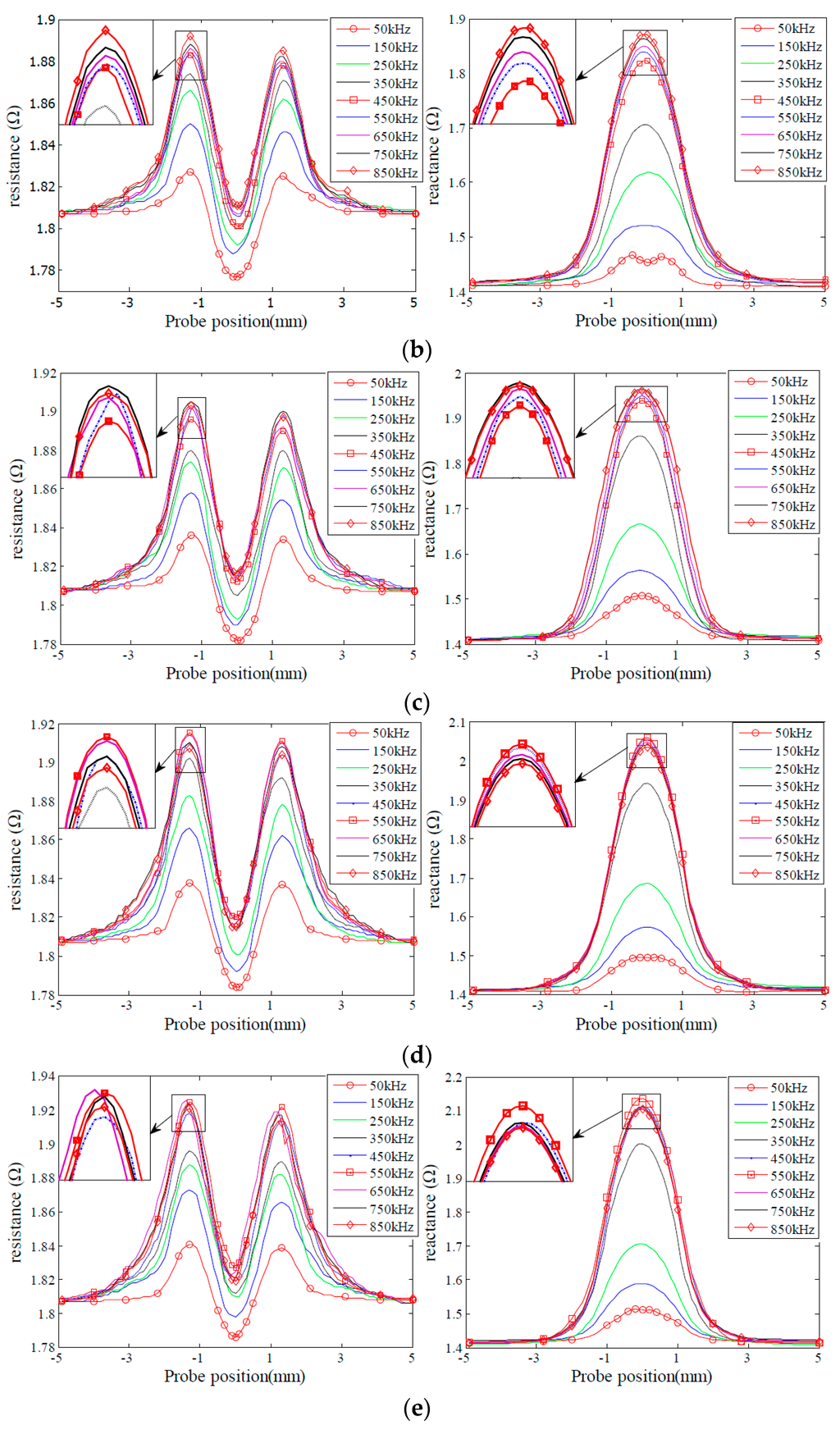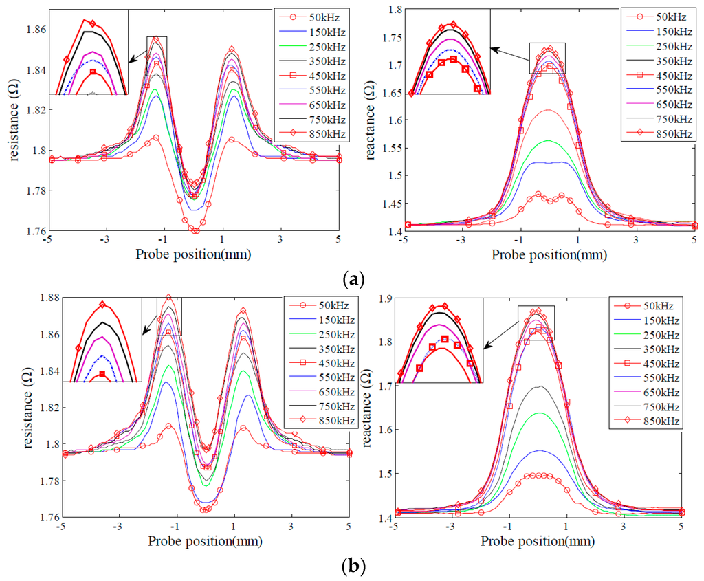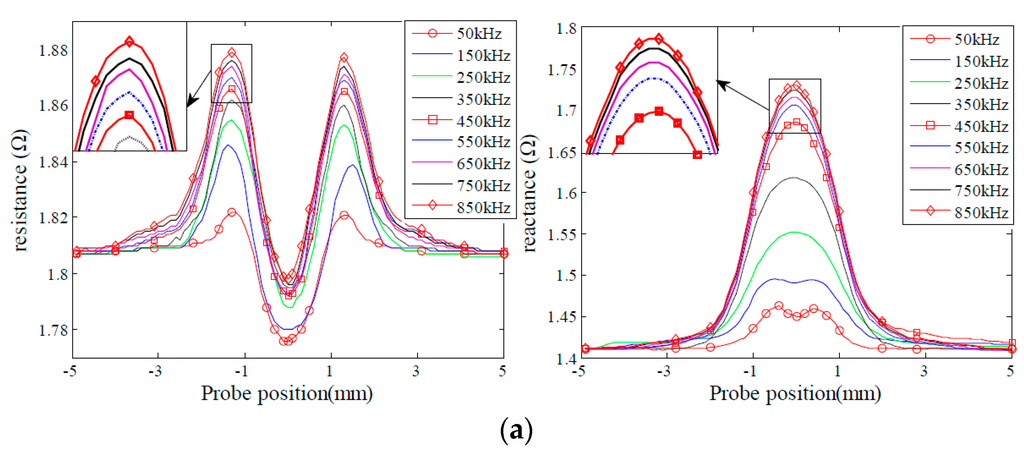 In order to analyze the effect of excitation frequency on defect sensitivity, experiments were carried out to acquire probe signals due to the given sets of the defects varying in depth and length, as shown in Figure 3 and Figure 4. The excitation frequencies are 50 kHz, 150 kHz, 250 kHz, 350 kHz, 450 kHz, 550 kHz, 650 kHz, 750 kHz and 850 kHz, respectively. It is observed that for the defects D1, D2, L1 and L2, both the resistance and reactance signals increase when the excitation frequency increases, and peak at 850 kHz. By contrast, for the defects D4 and D5, the probe signals increase initially, then reach a peak at 450 KHz, and decrease afterwards when the excitation frequency increases from 50 kHz to 850 kHz. Probe signals from the defects L4 and L5 possess similar characteristics to those from the defects D4 and D5. However, probe signals from the defects L4 and L5 reach a maximum at a frequency of 550 kHz. The observed phenomenon could be confirmed by the findings in [31,34] as well.