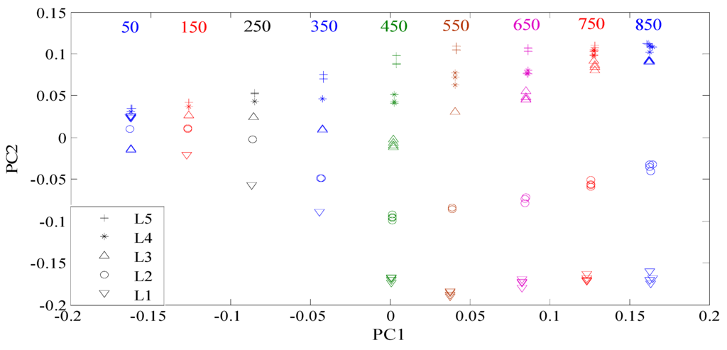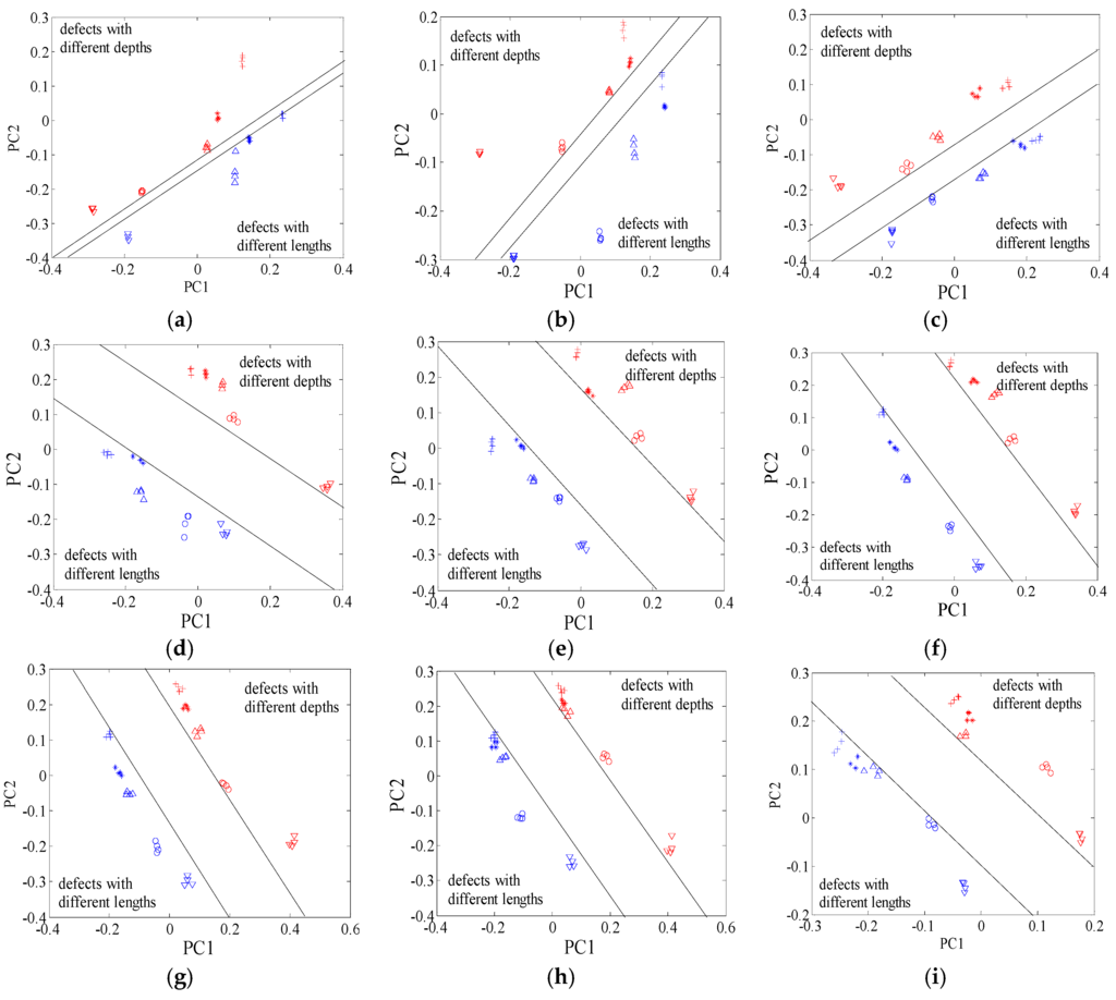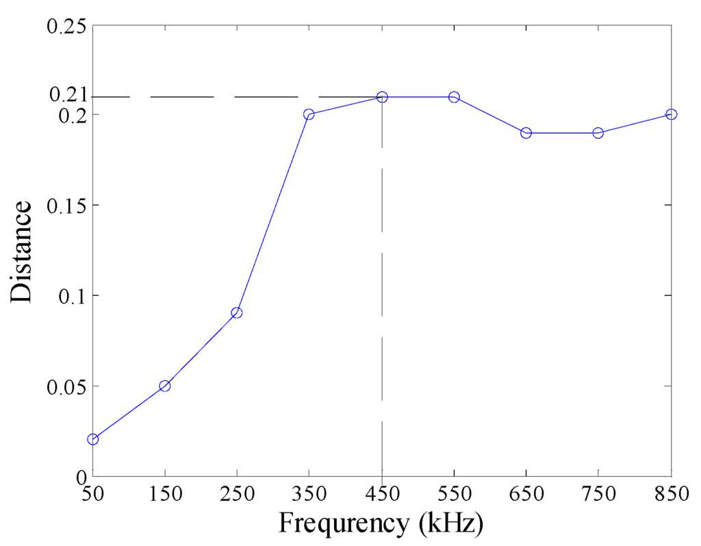 In this subsection, we aim at disclosing the influences of excitation frequency on the defect features. With the KPCA presented in Section 2, the defect features for identification were extracted from the probe signals, as shown in Figure 5. When excitation frequency increases from 50 kHz to 850 kHz, the margins between different type defects increase dramatically before 350 kHz, then remain almost constant, and decrease at 650 kHz, 750 kHz and 850 kHz, as shown in Figure 6.
