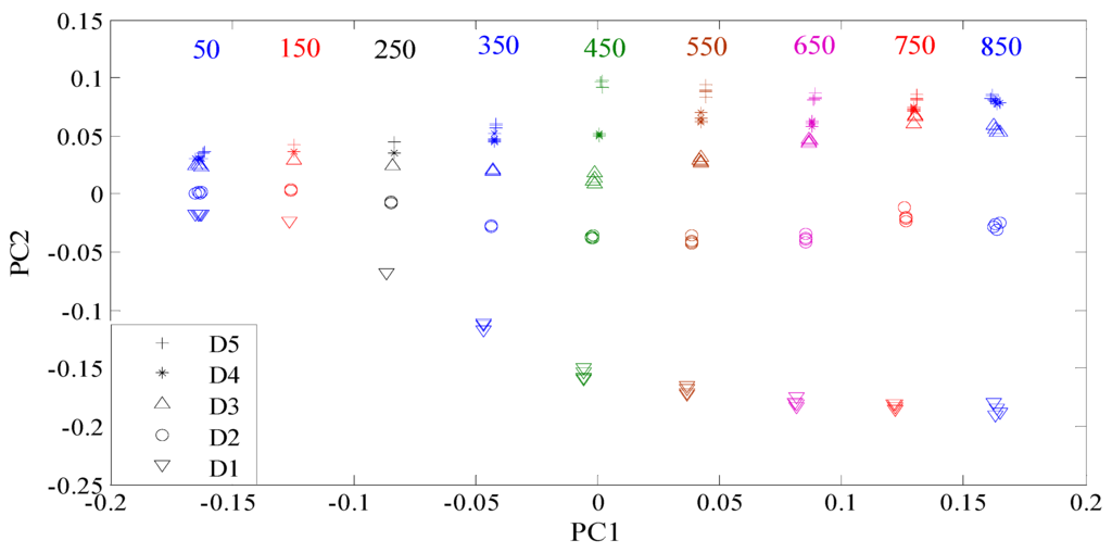 Here, all the manufactured defects are divided into two groups. Group 1 consists of the defects with different depths, while group 2 is composed of the defects with different lengths. All the features were reprocessed using the KPCA method. The features for group 1 and group 2 were shown in Figure 7 and Figure 8, respectively. From Figure 7, it can be seen that the contrast between the defect features for group 1 increases with the increase of the excitation frequency from 50 kHz to 450 kHz. When the frequency is higher than 450 kHz, the contrast between the features of the defects D1 and D2 continues increasing. Nevertheless, the differences between the features of the defects D3 and D4 and those of the defects D4 and D5 become smaller. Similar characteristics are also observed in Figure 8. For classification, the goal is to increase the contrast between the defect features according to the structural risk minimization principle [37,38], because large contrasts between different type defects correspond to good generalization capabilities and low misclassification probabilities. For the defects in group 1, the classification accuracy should increase gradually when the excitation frequency ranges from 50 kHz to 450 kHz. However, when the frequency is higher than 450 kHz, the classification accuracy is supposed to decrease. The analysis on the defects with different depths, which will be examined and confirmed in the following subsection, applies to defects with different lengths. In summary, the optimal contrasts between the defect features would be achieved if the excitation frequency is tuned at or near the frequency at which the maximum response from the largest defect is obtained.