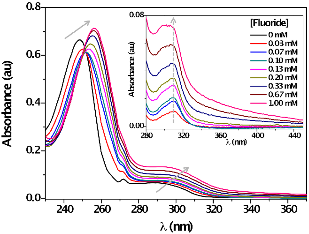 The UV-vis absorption spectra of 1 in MeCN in the absence of F¯ showed two bands centered at 249 nm and 290 nm. Upon titration with F¯, the ground state was affected; a bathochromic shift due to anion recognition on the two absorption maxima together with the appearance of an isosbestic point at 252 nm, clearly pointed out to the formation of new species (Figure 2). The reverse was true for other halide anions (i.e., Cl¯, Br¯, I¯) as slight-to-negligible changes in the UV-vis spectra in MeCN were observed upon addition of these species (Figure S10).