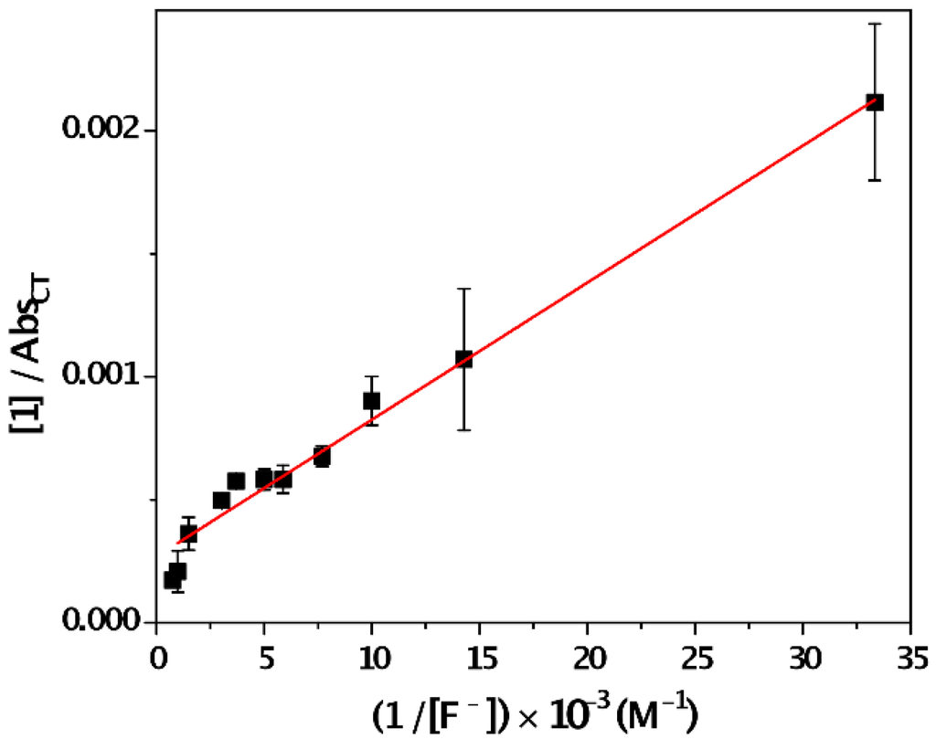 Benesi-Hildebrand plot used to determine the association constant of the CT complex formed by sensor 1 and F¯ (λmax = 300 nm) at different fluoride concentrations ([1] = 0.02 mM).